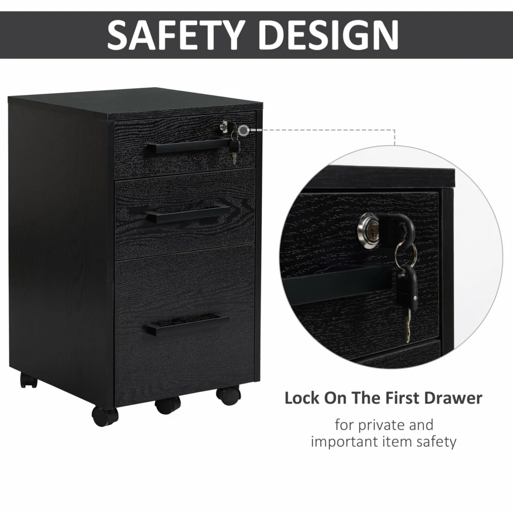 Η μονάδα γραφείου HOMCOM είναι ιδανική για την αποτελεσματική οργάνωση των εγγράφων σας. Διαθέτει 3 ευρύχωρα συρτάρια διαφορετικών μεγεθών και μπορείτε να κρατήσετε τα πιο σημαντικά έγγραφά σας ασφαλή χάρη στην κλειδαριά που είναι εξοπλισμένη με δύο κλειδιά. Οι 5 τροχοί (εκ των οποίων οι 2 με φρένα) σας επιτρέπουν να μετακινείτε άνετα το συρτάρι εγγράφων και να το κλειδώνετε στη θέση που σας βολεύει περισσότερο. Χάρη στον σχεδιασμό του, μπορεί να τοποθετηθεί κάτω από το γραφείο για εξοικονόμηση χώρου.