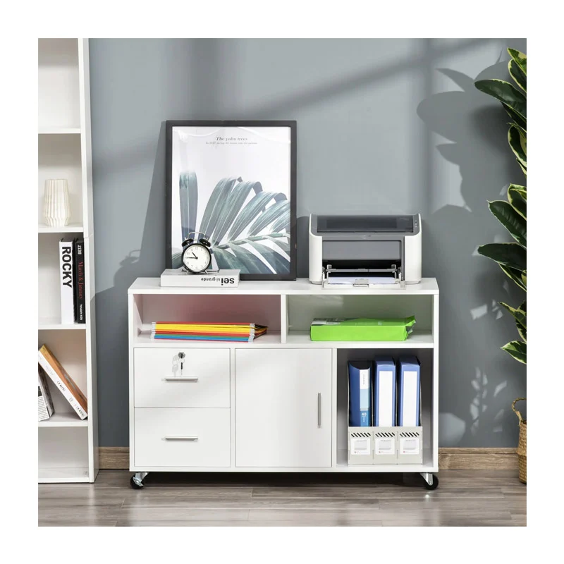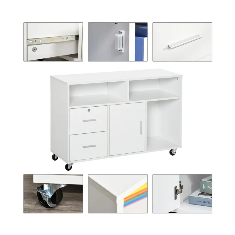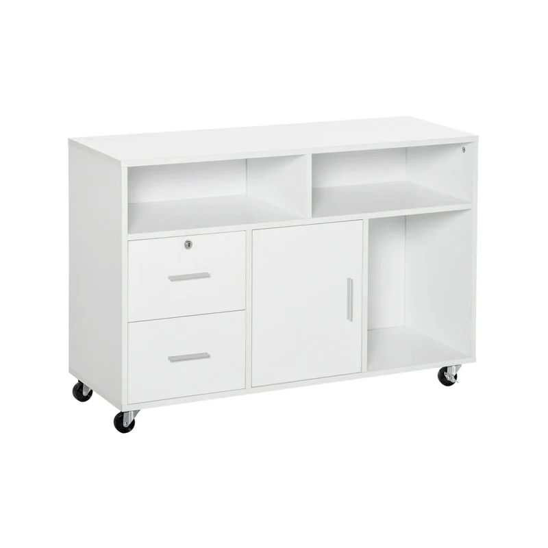 Τροχήλατο Ξύλινο Έπιπλο Γραφείου με 1 Ντουλάπι 3 Ράφια και 2 Συρτάρια 100 x 35 x 65 cm Χρώματος Λευκό HOMCOM 836-269WT