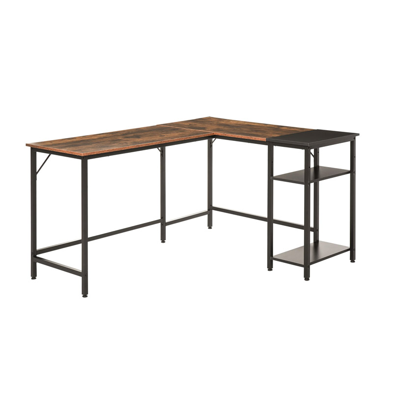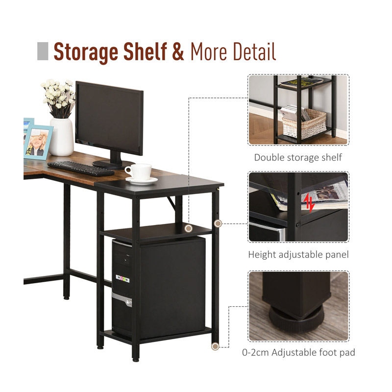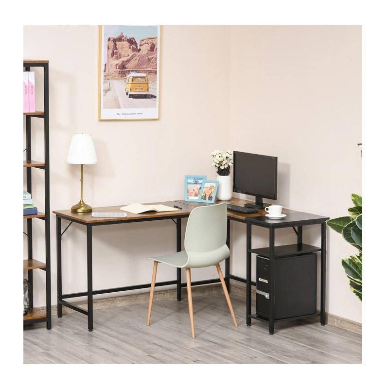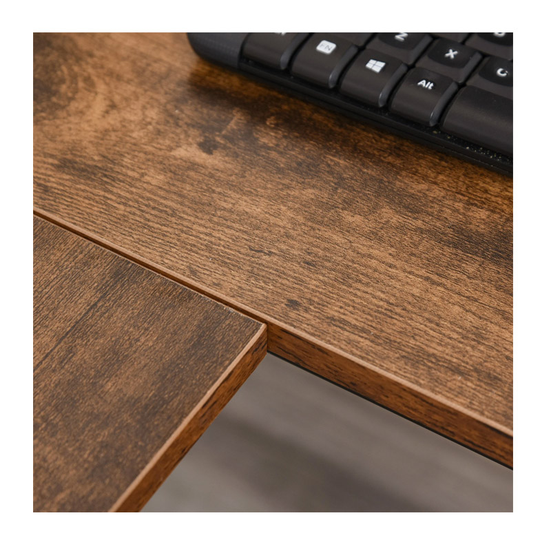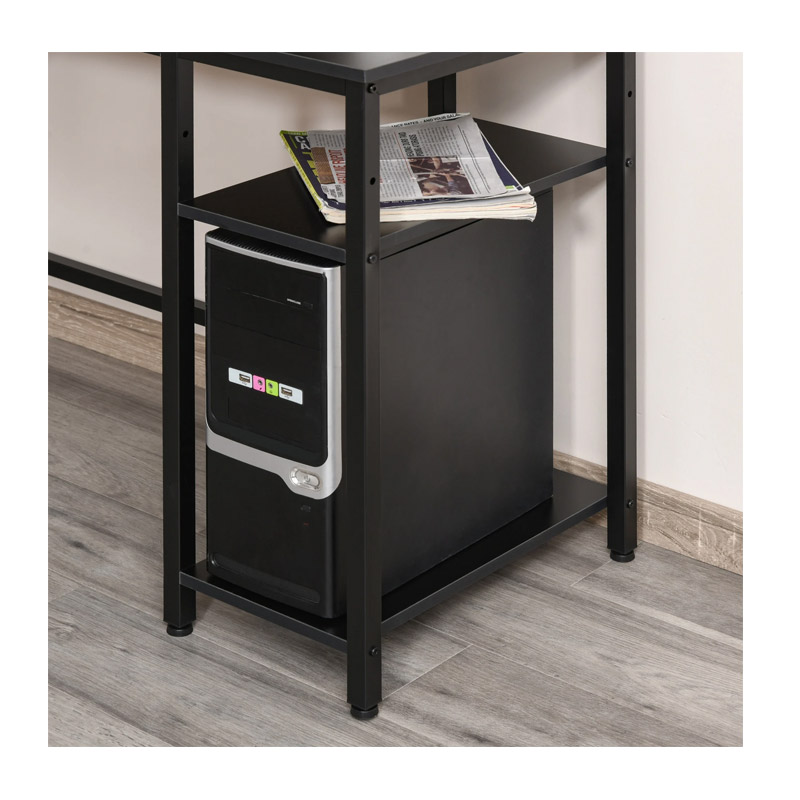 Το γωνιακό γραφείο, από την εταιρία HOMCOM, διαθέτει μεταλλικό σκελετό και επιφάνεια από μοριοσανίδες τύπου Ε1. Είναι εξοπλισμένο με επιπρόσθετο μεταλλικό ράφι στο πλάι για την τοποθέτηση του πύργο του υπολογιστή (με ρυθμιζόμενο ράφι), έχει ρυθμιζόμενα πόδια για να διατηρείται σταθερό και αντέχει βάρος έως 50 Kg.