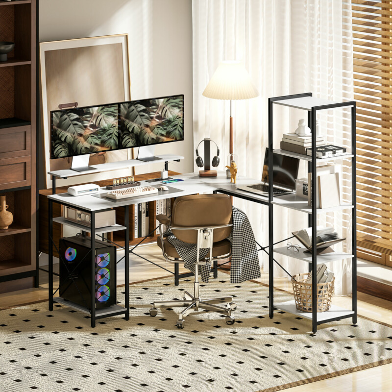 - Γραφείο με πλευρικό ράφι πέντε επιπέδων και κάτω ράφι με CPU, για αποθήκευση πολλών απαραίτητων αντικειμένων