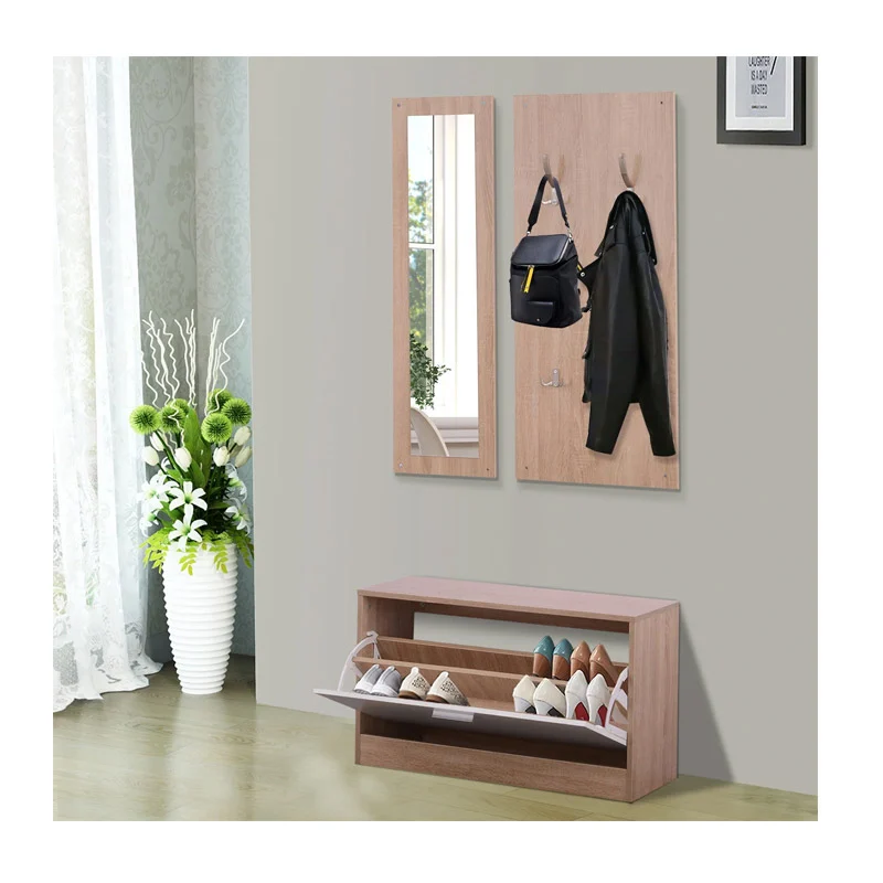 Το σετ εισόδου, από την εταιρία HOMCOM, αποτελείται από μία παπουτσοθήκη με κομψό και minimal σχεδιασμό, μία κρεμάστρα με 2 μεγάλα και 2 μικρά άγκιστρα για ρούχα, καπέλα, κασκόλ και έναν μεγάλο καθρέπτη. Κατασκευασμένα από μοριοσανίδες, ταιριάζουν απόλυτα με την διακόσμηση κάθε χώρου.
