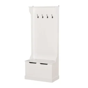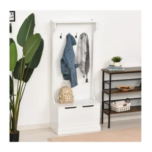 Το έπιπλο εισόδου, από την εταιρία HOMCOM, είναι κατασκευασμένο από ανθεκτικό ξύλο MDF για μακροχρόνια χρήση και ταιριάζει απόλυτα με την διακόσμηση κάθε χώρου. Διαθέτει 4 άγκιστρα για ρούχα, καπέλα, κασκόλ, και έναν πάγκο που μπορεί να χρησιμοποιηθεί σαν κάθισμα και διαθέτει εσωτερικό αποθηκευτικό χώρο. Μπορεί να στερεωθεί στο τοίχο για μεγαλύτερη ασφάλεια και σταθερότητα.