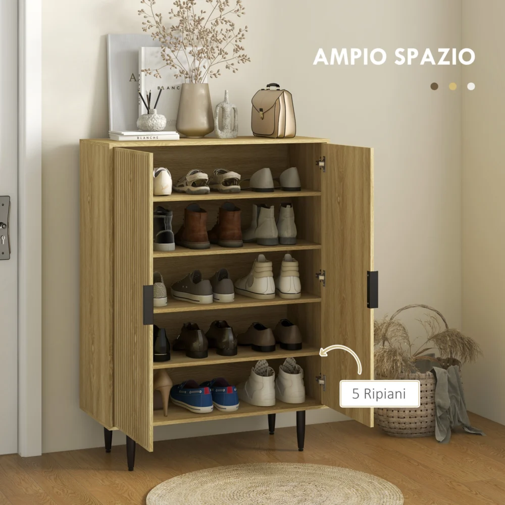 Η παπουτσοθήκη εισόδου HOMCOM προσφέρει χώρο για να χωρέσει έως και 15 ζευγάρια παπούτσια σε 5 επίπεδα. Δύο από τα εσωτερικά ράφια ρυθμίζονται σε τρία επίπεδα, για να δημιουργήσουν τον κατάλληλο χώρο για την αποθήκευση μποτών, αθλητικών παπουτσιών και άλλων. Κατασκευασμένη με ένα κομψό πάνελ μοριοσανίδας επενδυμένο με μελαμίνη και κομψά μεταλλικά πόδια, αυτό το έπιπλο παπουτσοθήκης προσδίδει μια μοντέρνα πινελιά σε οποιοδήποτε περιβάλλον.