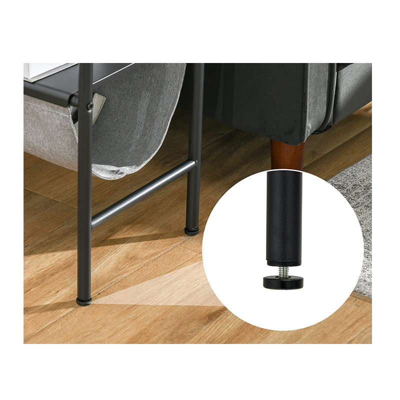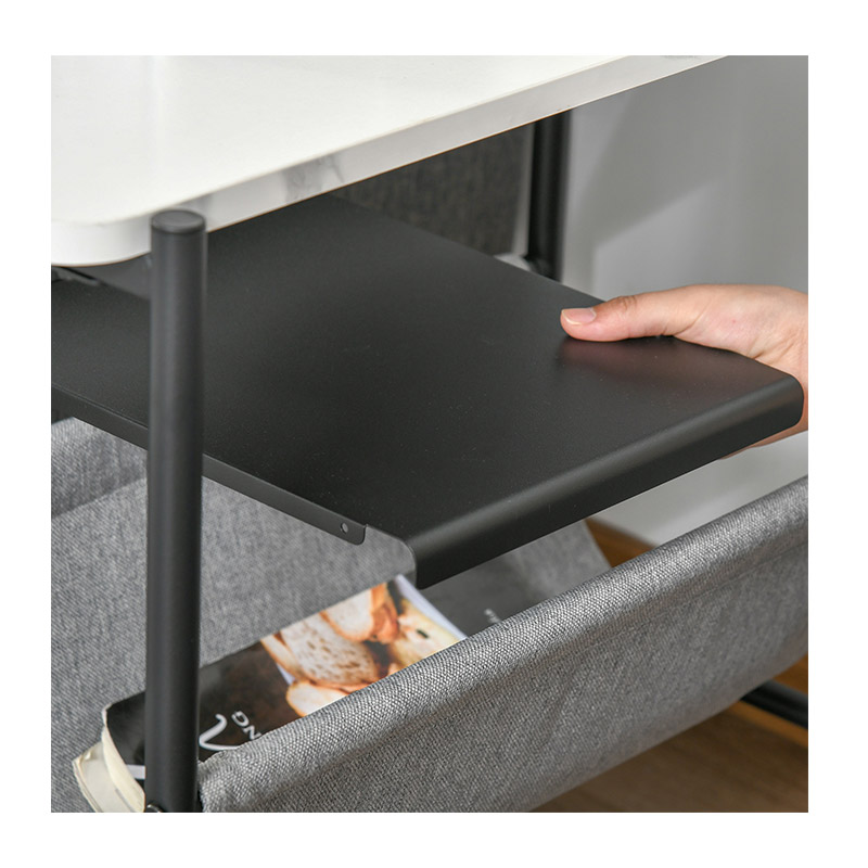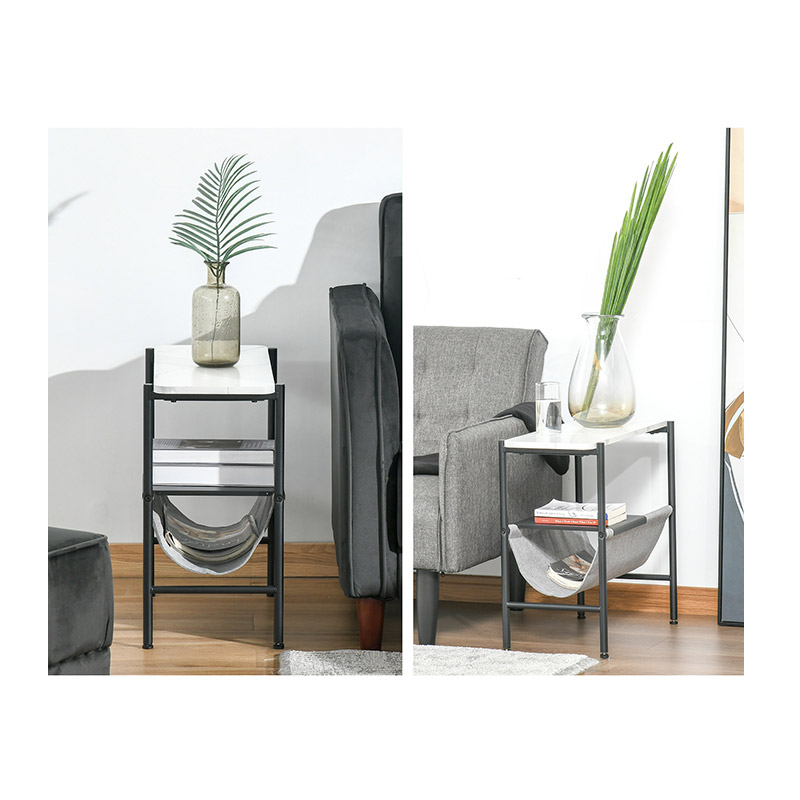 Το τραπεζάκι, διαθέτει ένα μεταλλικό και αφαιρούμενο ράφι, καθώς και ένα υφασμάτινο ράφι από πολυεστέρα. Αναδιπλούμενο και ευέλικτο, μπορείτε να το χρησιμοποιήσετε για να φιλοξενήσετε περιοδικά, βιβλία ή ηλεκτρονικές συσκευές.