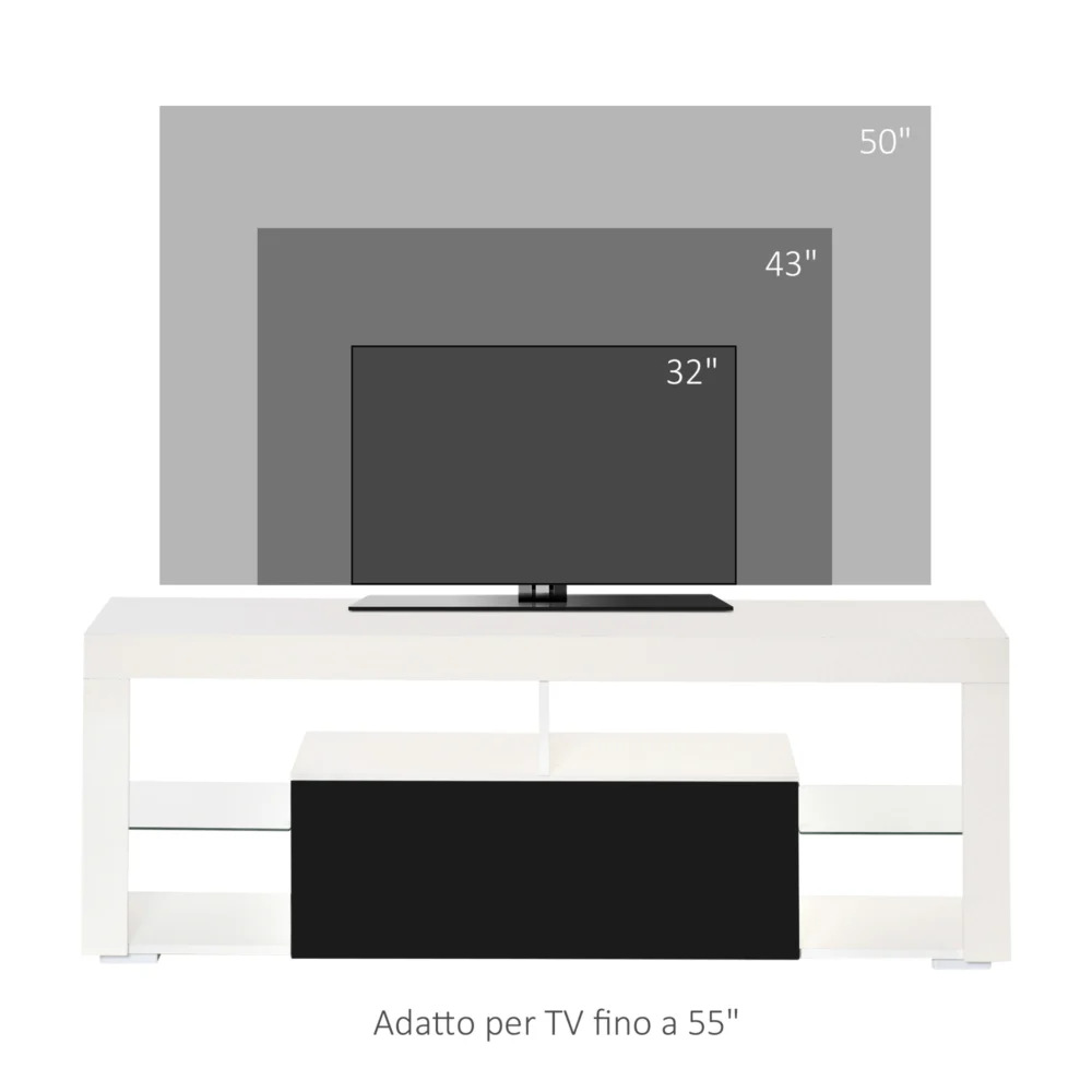 Το έπιπλο τηλεόρασης, από την εταιρία HOMCOM, είναι κατασκευασμένο από λακαρισμένο ξύλο MDF, για μέγιστη ανθεκτικότητα. Η επιτραπέζια επιφάνεια των 40 cm είναι κατάλληλη για τηλεοράσεις έως 55″. Με 6 ράφια και ένα μεγάλο συρτάρι, είναι ιδανικό για την αποθήκευση τηλεχειριστηρίων και συσκευών πολυμέσων. Τα γυάλινα ράφια είναι εξοπλισμένα με φως LED RGB. Χρησιμοποιώντας το τηλεχειριστήριο, μπορείτε να ρυθμίσετε 20 χρώματα φώτων RGB, 2 ταχύτητες φωτισμού (γρήγορη και αργή), 6 λειτουργίες φωτισμού (auto, flash, fade3, fade7, jump3, jump7) και 6 κουμπιά για να δημιουργήσετε τα χρώματα της επιλογής σας.