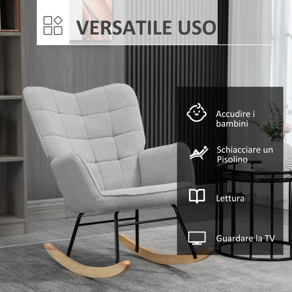 HOMCOM Πολυθρόνα Κουνιστή Επενδεδυμένη από Ξύλο και Ατσάλι με Επένδυση Bouclé, 71x98x101 εκ., Γκρι 839-613V00LG