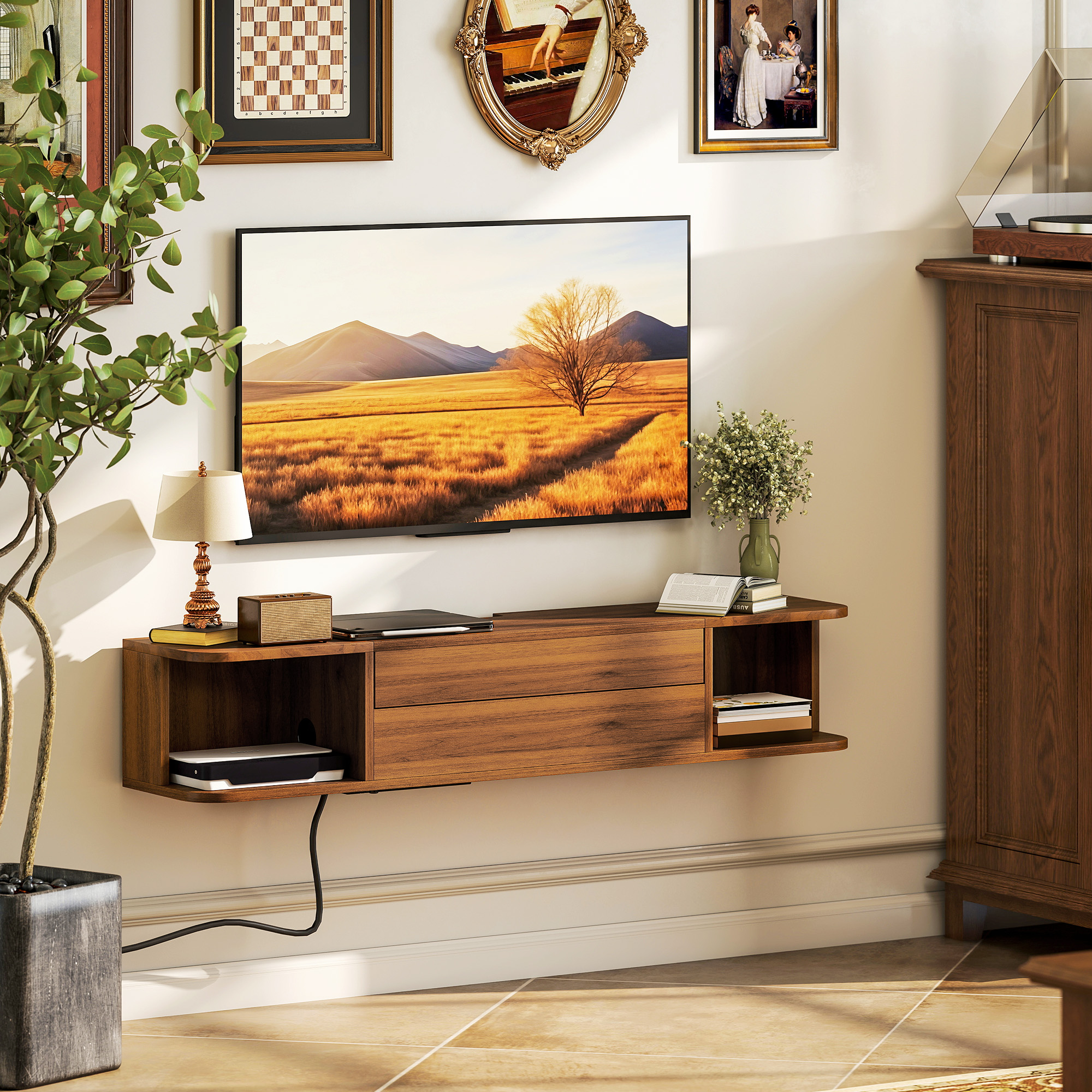 HOMCOM Κρεμαστή Βάση Τηλεόρασης έως 50″ με Πρίζες Ρεύματος, USB και Τύπου C, Συρτάρι και Ράφια, 120x24x22.4 cm, Καρυδιά 83B-525V90WN