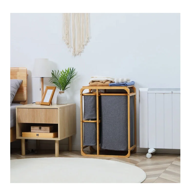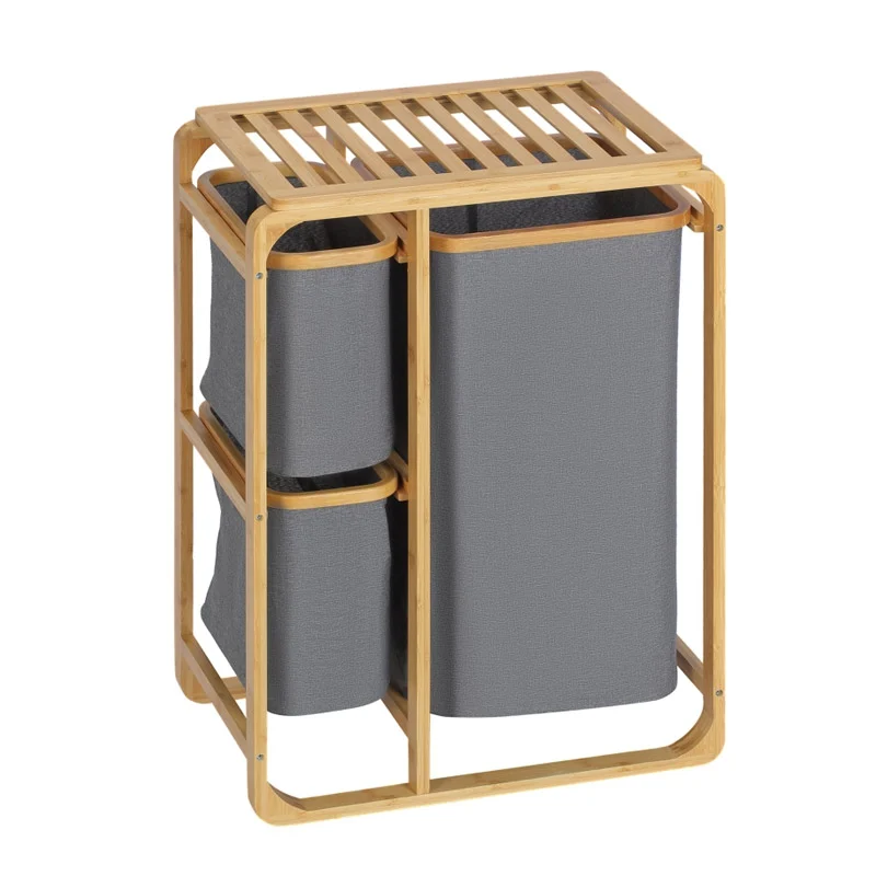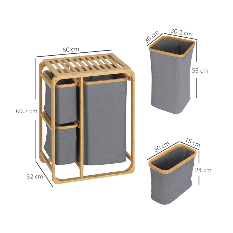 Το καλάθι απλύτων, από την εταιρία HOMCOM, διαθέτει δομή από μπαμπού, η οποία εξασφαλίζει αντοχή και χαρίζει κομψή εμφάνιση. Το καλάθι, χωρίζεται σε 3 συρόμενα τμήματα με υφασμάτινες, αφαιρούμενες και πλενόμενες τσάντες, 2 μικρές και μία μεγάλη. Έτσι, ο διαχωρισμός των ρούχων θα είναι ευκολότερος όταν πρέπει να τα πλύνετε. Στο πάνω μέρος, έχει πρακτικό ράφι στο οποίο μπορείτε να τοποθετήσετε τα καθημερινά σας είδη.