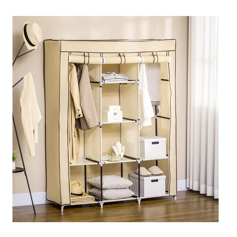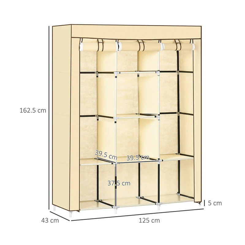 Η φορητή ντουλάπα, από την εταιρία HOMCOM, διαθέτει ανθεκτικό ατσάλινο σκελετό με πλαστικές συνδέσεις και δεν απαιτεί επιπλέον εργαλεία συναρμολόγησης. Θα σας βοηθήσει να έχετε εύκολη πρόσβαση στα ρούχα σας και να τα έχετε πάντα οργανωμένα και διπλωμένα. Διαθέτει στο εσωτερικό της 8 συνολικά ράφια και 2 ράγες για μπορείτε να κρεμάσετε σακάκια ή πουκάμισα.