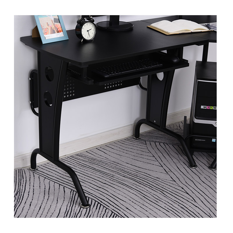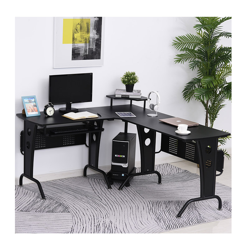 Το γωνιακό γραφείο, από την εταιρία HOMCOM, διαθέτει μοναδικό σχεδιασμό σε σχήμα “L” και μπορεί να προσαρμοστεί ανάλογα με το χώρο σας. Διαθέτει δύο μεγάλες επιφάνειες εργασίας και μία μικρή στη μέση. Χρησιμοποιώντας ατσάλι για το πλαίσιο, η δομή είναι αξιόπιστη και στιβαρή, εξοπλισμένη με μαύρα ράφια από MDF επικαλυμμένα με μελαμίνη που είναι συμπαγή και εξίσου στιβαρά.
