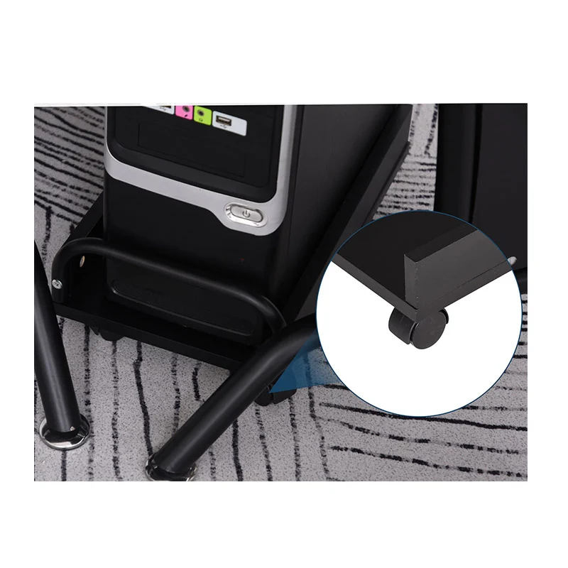 Το γραφείο, έχει ρυθμιζόμενα πόδια για να διατηρεί την ισορροπία, συρόμενο δίσκο πληκτρολογίου, ράφι για τον εκτυπωτή στο πάνω μέρος, μεταλλικές πλάκες στο πίσω μέρος για προστασία και αφαιρούμενη βάση για τον πύργο του υπολογιστή.