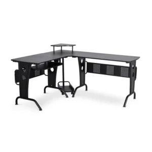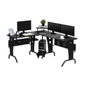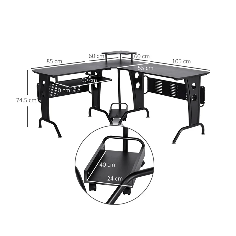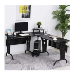 Το γωνιακό γραφείο, από την εταιρία HOMCOM, διαθέτει μοναδικό σχεδιασμό σε σχήμα “L” και μπορεί να προσαρμοστεί ανάλογα με το χώρο σας. Διαθέτει δύο μεγάλες επιφάνειες εργασίας και μία μικρή στη μέση. Χρησιμοποιώντας ατσάλι για το πλαίσιο, η δομή είναι αξιόπιστη και στιβαρή, εξοπλισμένη με μαύρα ράφια από MDF επικαλυμμένα με μελαμίνη που είναι συμπαγή και εξίσου στιβαρά.