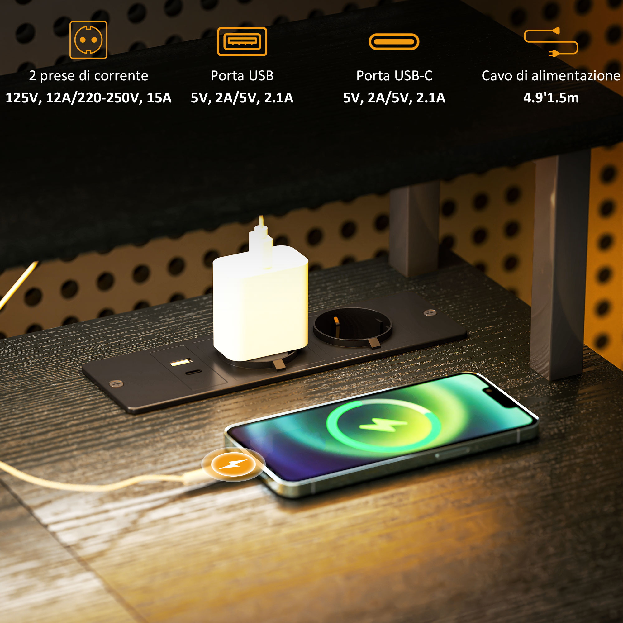 Η γραφείο υπολογιστή HOMCOM προσφέρει αναστρέψιμο σχεδιασμό για να προσαρμόζεται τέλεια στον χώρο σας. Ο σταθμός φόρτισης με δύο πρίζες, μία θύρα USB και μία θύρα USB-C επιτρέπει τη σύνδεση όλων των συσκευών σας. Τα LED φώτα RGB σας επιτρέπουν να επιλέξετε το αγαπημένο σας χρώμα και λειτουργία για να δημιουργήσετε τη σωστή ατμόσφαιρα. Η διπλή ανύψωση για οθόνη καθιστά αυτό το μοντέρνο γραφείο εργονομικό και ιδανικό για τη διατήρηση σωστής στάσης. Χαρακτηριστικά: