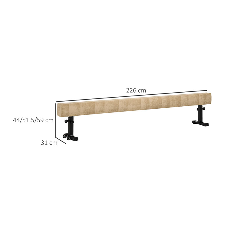 Η δοκός ισορροπίας, από την εταιρία HOMCOM, έχει ξύλινη κατασκευή με βελούδινη επένδυση από πολυεστέρα και μασίφ ατσάλινη βάση. Με μήκος 226 cm και ρύθμιση του ύψους σε 3 διαφορετικά επίπεδα. Τα πόδια που είναι επικαλυμμένα με καουτσούκ εξασφαλίζουν τη μέγιστη σταθερότητα και οι δύο ενσωματωμένοι τροχοί σας επιτρέπουν να την μετακινείτε εύκολα.