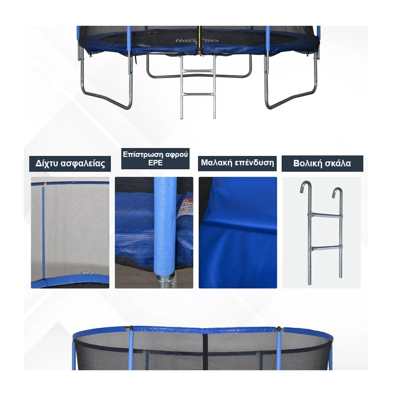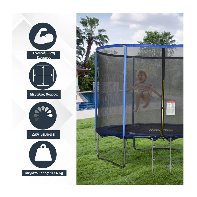 Το τραμπολίνο διαθέτει δίχτυ ασφαλείας γύρω από την περίμετρο, μαλακά μαξιλαράκια και ελατήρια καλυμμένα με αφρό EPE για την αποφυγή τραυματισμών. Η βάση του διαθέτει είσοδο με φερμουάρ και κλειδαριά ασφαλείας για τα παιδιά, ώστε να παίζουν χωρίς να ανησυχείτε. Το παιχνίδι στο τραμπολίνο δεν προσφέρει μόνο διασκέδαση, αλλά και εκπαιδεύει τους μύες σας, την ευελιξία και την ισορροπία. Είναι ιδανικό για μικρούς και μεγάλους, να διασκεδάζετε και να παραμείνετε σε φόρμα ταυτόχρονα.