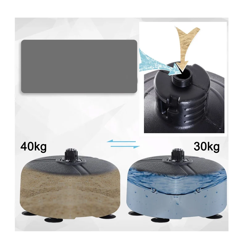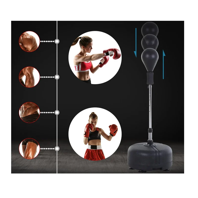 Η βάση του είναι κατασκευασμένη από πλαστικό PE με 4 βεντούζες, για καλύτερη προσκόλληση στο έδαφος και μπορεί να γεμίσει με νερό ή άμμο για να αυξήσει το βάρος της. Ο στύλος είναι κατασκευασμένος από ατσάλι και το ύψος του είναι ρυθμιζόμενο σε 4 επίπεδα (136, 142, 148 και 154 cm). Το αχλάδι και τα γάντια καλύπτονται από συνθετικό δέρμα, για να σας προσφέρουν τη μέγιστη άνεση κατά τη διάρκεια της προπόνησης.