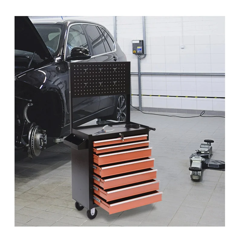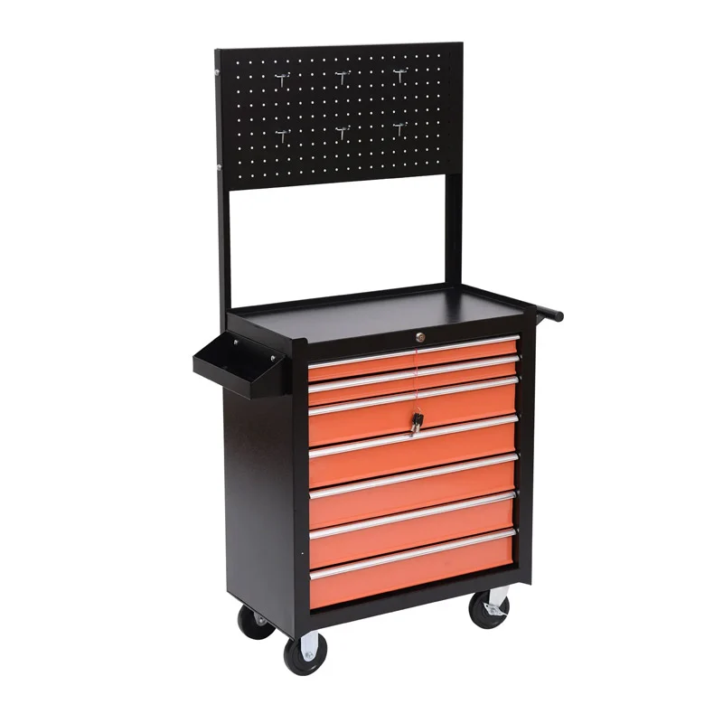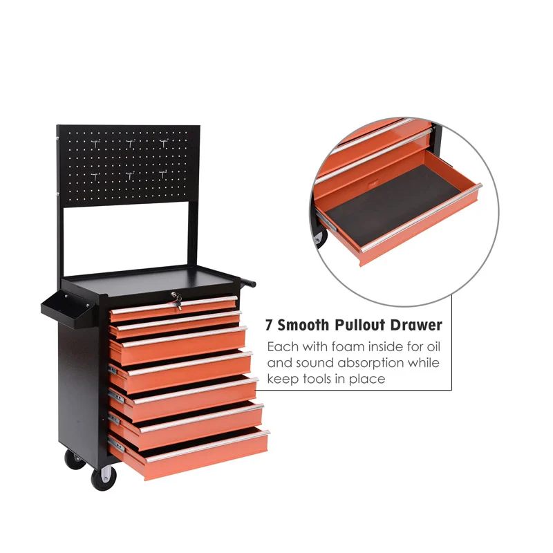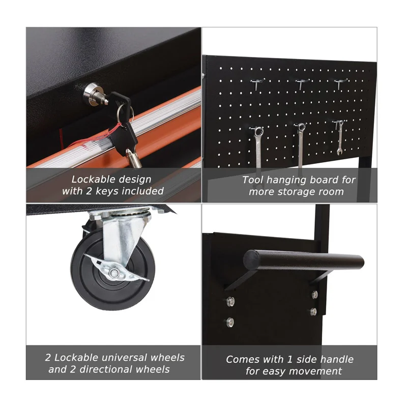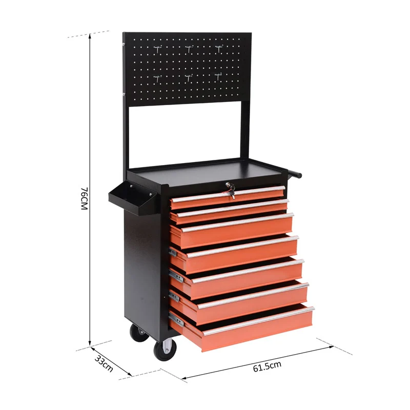Ο εργαλειοφορέας, από την εταιρία HOMCOM, είναι κατασκευασμένος από εξαιρετικά ανθεκτικό και συμπαγές φύλλο χάλυβα, προσεκτικά επεξεργασμένο. Προσφέρει αρκετό χώρο για την αποθήκευση όλων των εργαλείων σας χάρη στα 7 συρτάρια (2 μικρά στο πάνω μέρος και 5 μεγάλα στο κάτω). Το ράφι κάθε συρταριού είναι επενδεδυμένο με υλικό EVA, διαθέτει 2 κλειδιά που εγγυώνται την ασφάλεια και 4 τροχούς, εκ των οποίων οι 2 τροχοί πολλαπλών κατευθύνσεων με φρένο που κλειδώνει.
