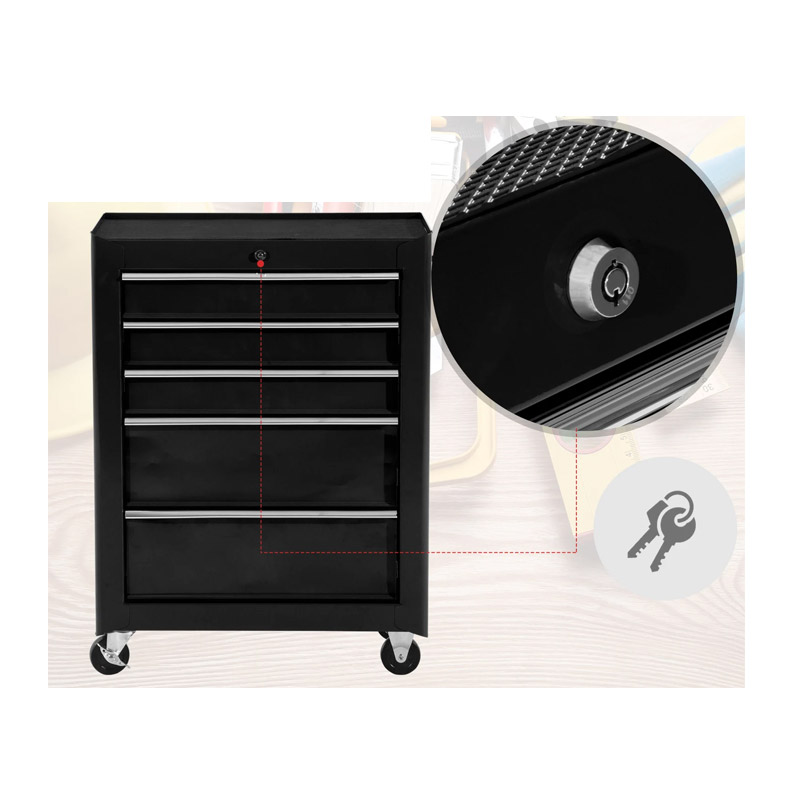 Ο εργαλειοφορέας, από την εταιρία HOMCOM, έχει στιβαρό ατσάλινο πλαίσιο και εξαιρετική ποιότητα κατασκευής. Διαθέτει 5 πρακτικά συρτάρια (3 μεγάλα και 2 μικρά) για τη διατήρηση όλων των εργαλείων εργασίας σας σε τάξη και πάντα στη διάθεσή σας. Το ράφι κάθε συρταριού είναι επενδεδυμένο με υλικό EVA, διαθέτει 2 κλειδιά που εγγυώνται την ασφάλεια και 4 τροχούς, εκ των οποίων οι 2 τροχοί πολλαπλών κατευθύνσεων με φρένο που κλειδώνει.