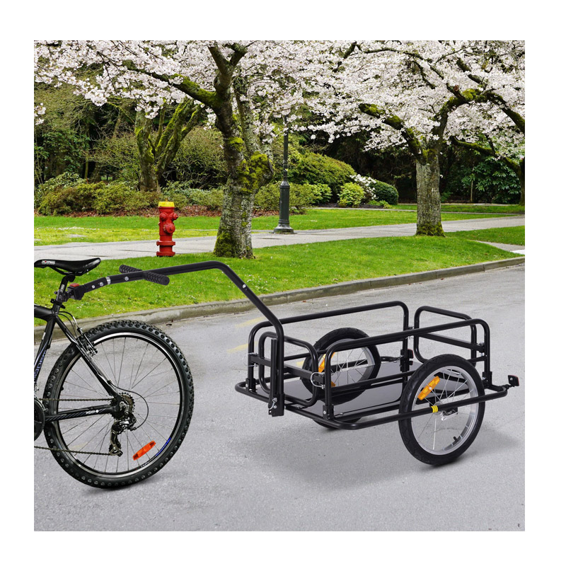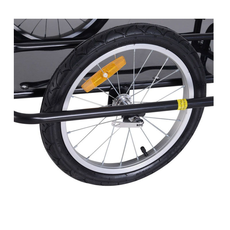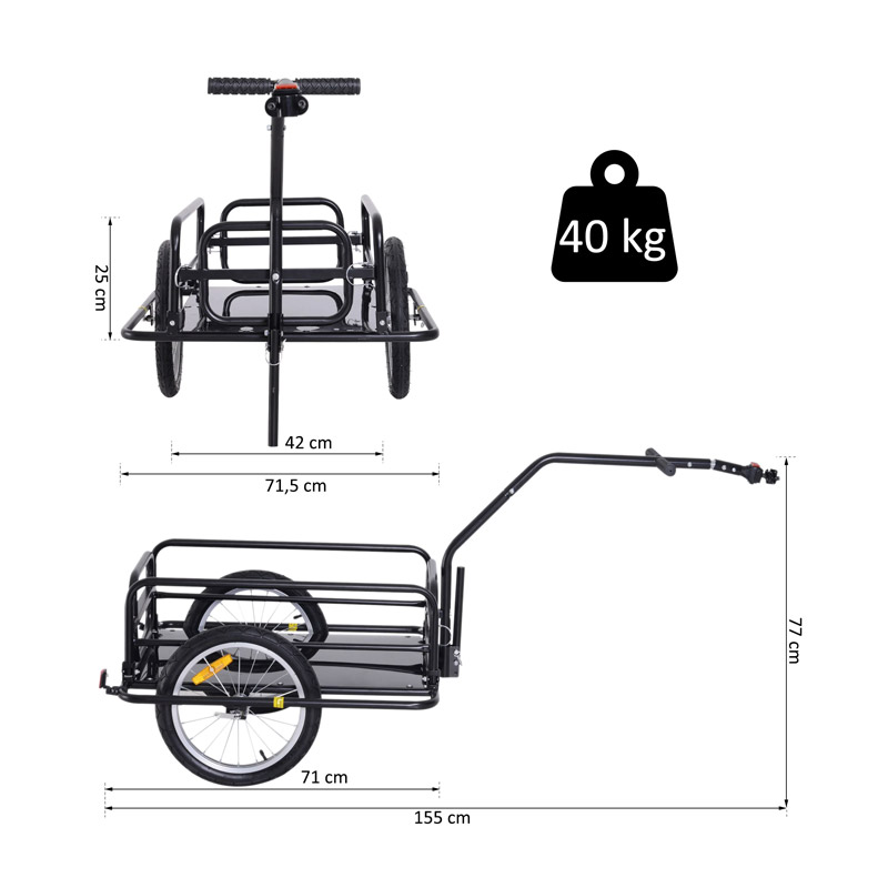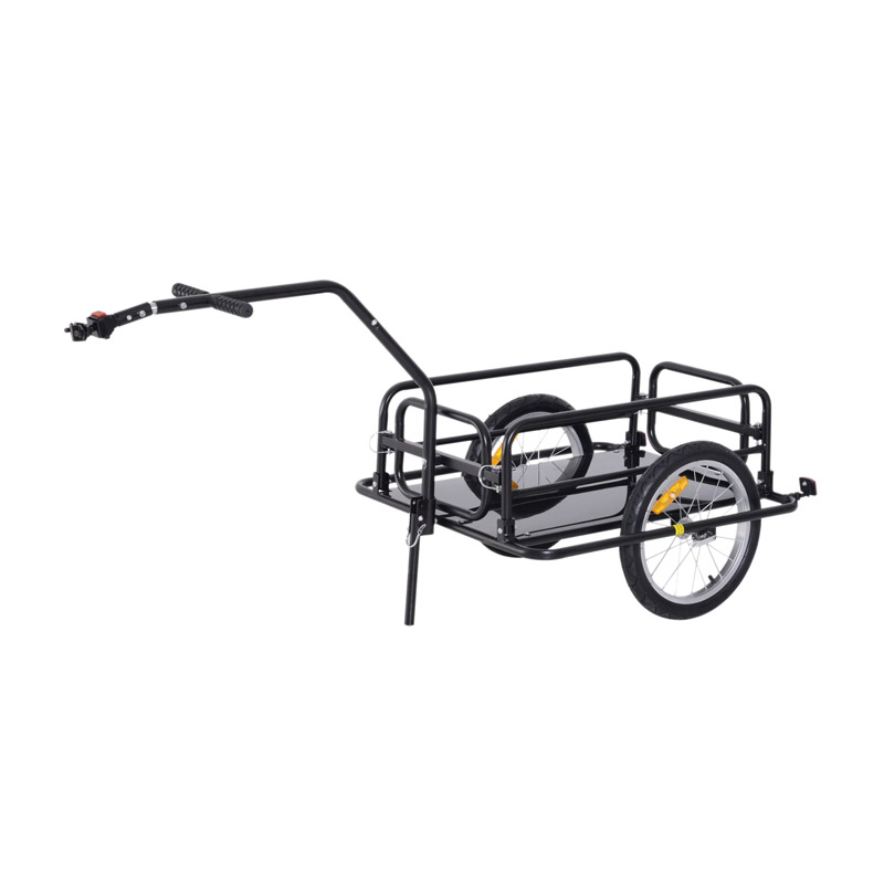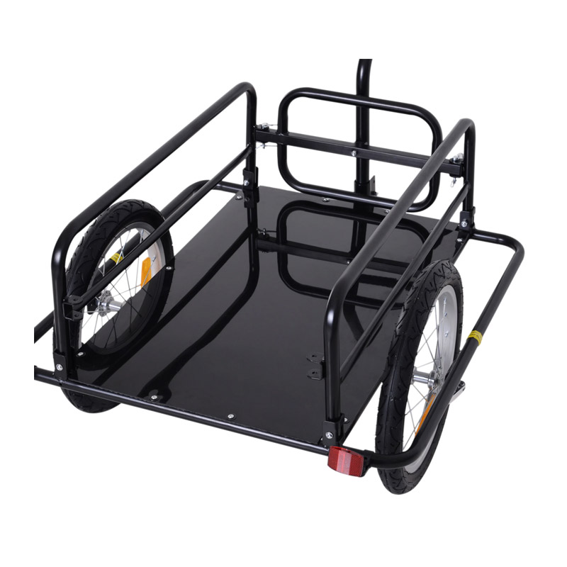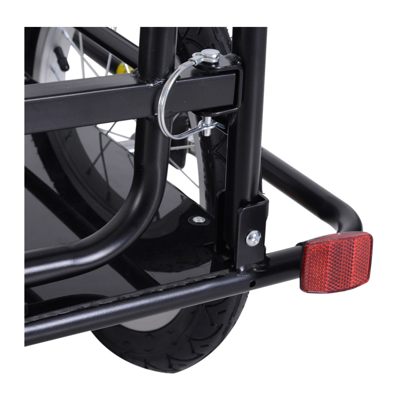 Το τρέιλερ ποδηλάτου, από την εταιρεία HOMCOM, διαθέτει ανθεκτικό ατσάλινο πλαίσιο και πλαστικό κάτω μέρος. Τα εμπρός, πίσω και πλευρικά τοιχώματα μπορούν εύκολα να αποσπαστούν για να δημιουργήσουν περισσότερο χώρο. Αντέχει βάρος έως 40 Kg, εύκολη συναρμολόγηση και είναι αναδιπλούμενο για εύκολη αποθήκευση και μεταφορά.