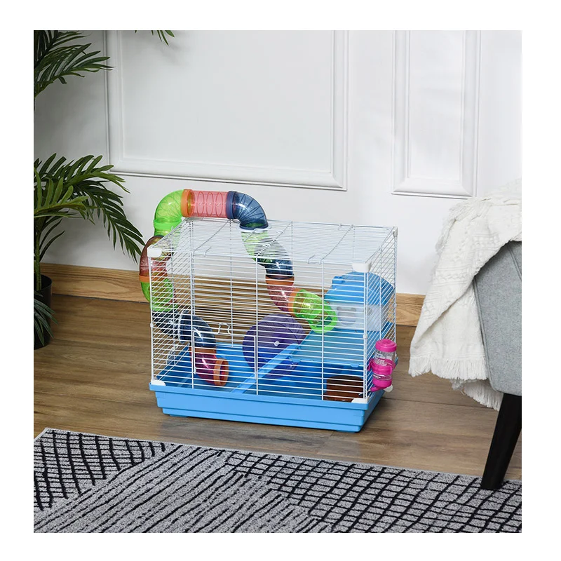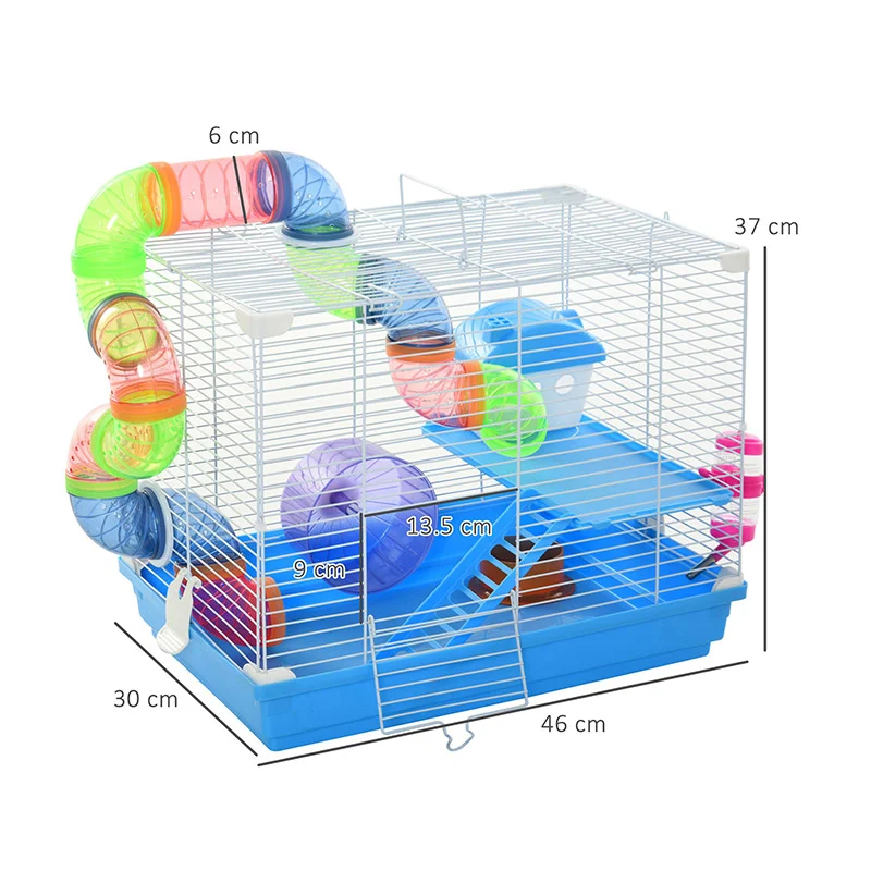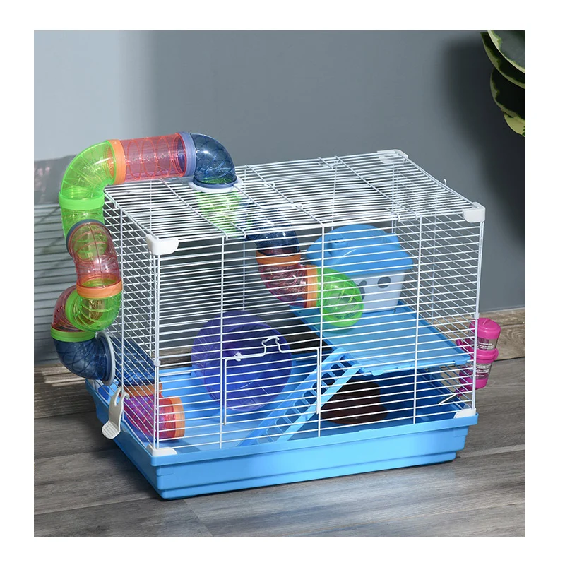 Το κλουβί, από την εταιρία PawHut, προσφέρει άσκηση, διασκέδαση, χαλάρωση και εξερεύνηση για μικρά κατοικίδια ζώα, όπως χάμστερ και ποντίκια. Ο σχεδιασμός 2 επιπέδων τους δίνει χώρο για να κινούνται και να παραμένουν ενεργά. Διαθέτει μια πλατφόρμα, μια μεγάλη σήραγγα που πηγαίνει μέσα και έξω, έναν τροχό άσκησης, ένα πιάτο φαγητού και ένα μπουκάλι για νερό. Εξοπλισμένο με λαβή για εύκολη μεταφορά και αφαιρούμενο δίσκο στο κάτω μέρος για εύκολο καθάρισμα.