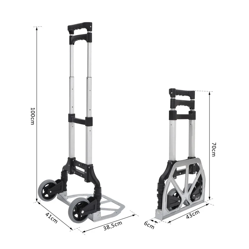 Το καρότσι μεταφοράς, από την εταιρία HOMCOM, διαθέτει πτυσσόμενη και ανθεκτική κατασκευή από αλουμίνιο και μπορεί να φορτώσει περίπου 70 Kg. Λόγω της ρυθμιζόμενης λαβής σε ύψος 3 βημάτων (100, 90 και 60 cm), είναι κατάλληλο για προϊόντα διαφόρων μεγεθών.