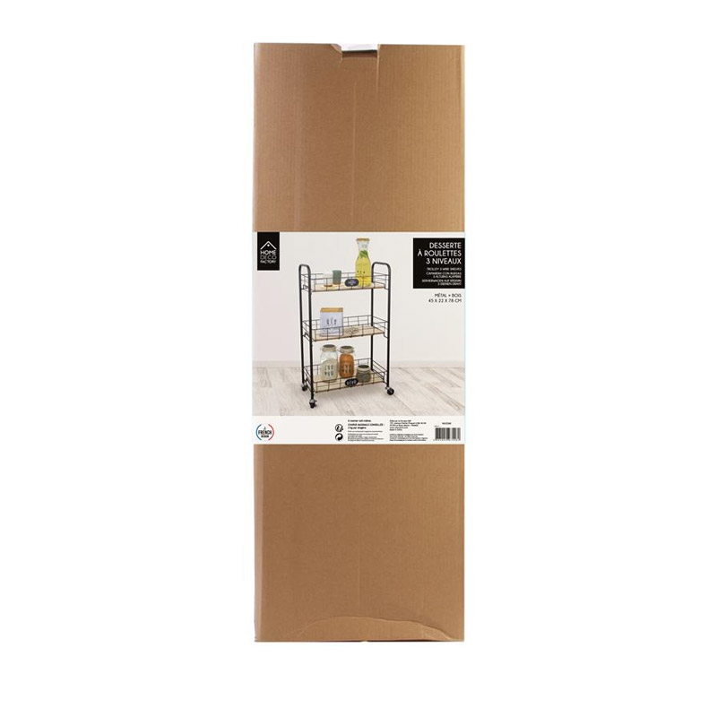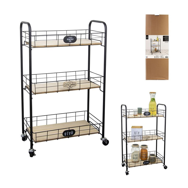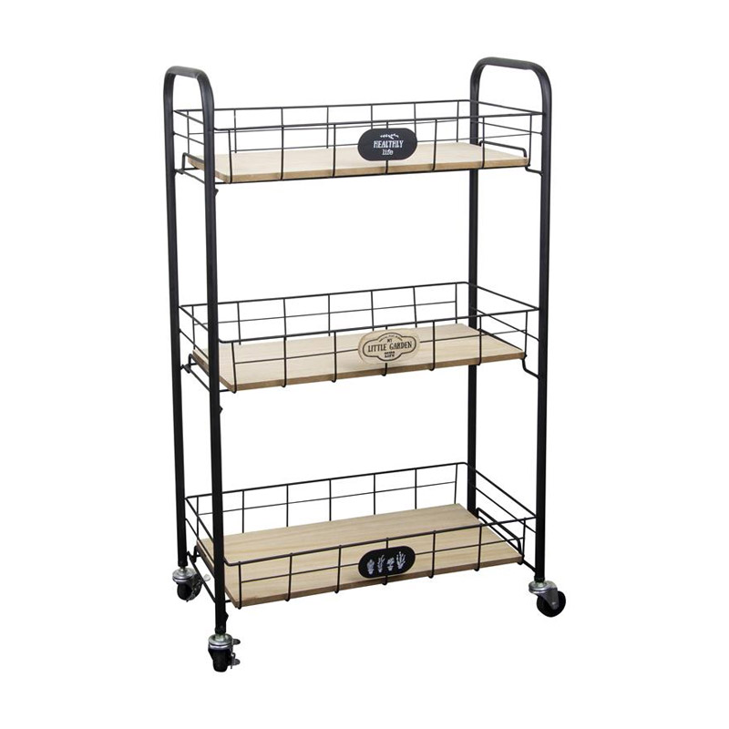 Το τρόλεϊ κουζίνας, από την εταιρία Home Deco Factory, διαθέτει μεταλλικό, ανθεκτικό σκελετό και 3 ξύλινα ράφια. Είναι ιδανικό για την αποθήκευση τροφίμων, σκετών ή μικροεργαλείων κουζίνας. Μπορεί επίσης να χρησιμοποιηθεί και σαν επιπλέον αποθηκευτικός χώρος στο μπάνιο σας. Έχει 4 τροχούς για εύκολη μετακίνηση.