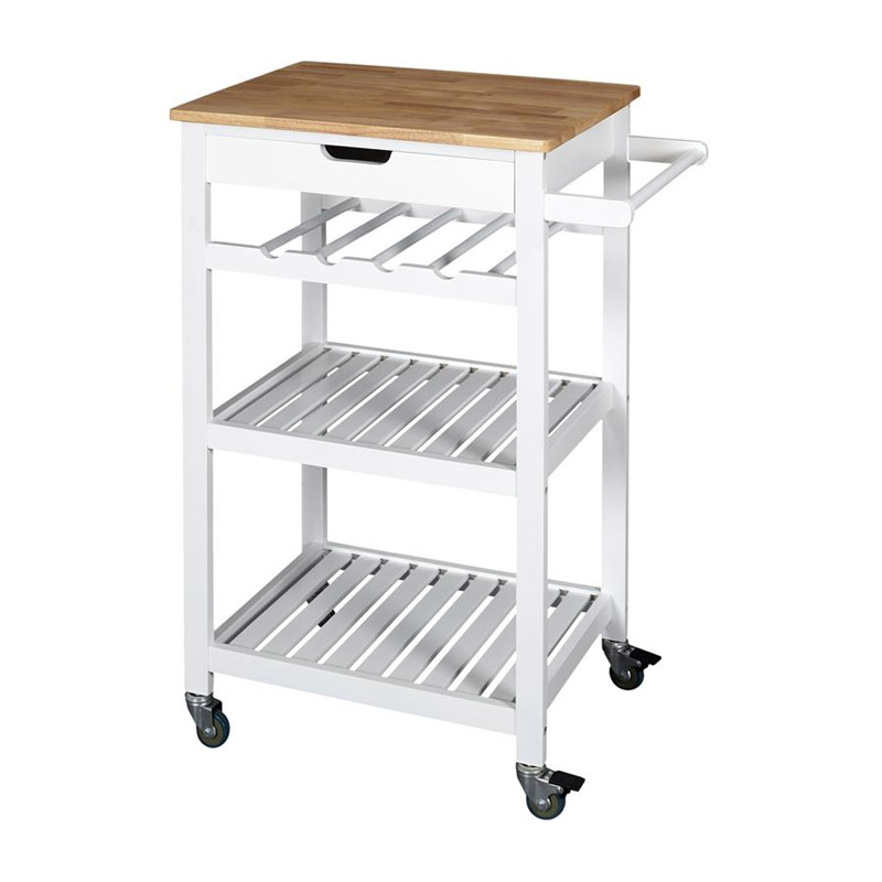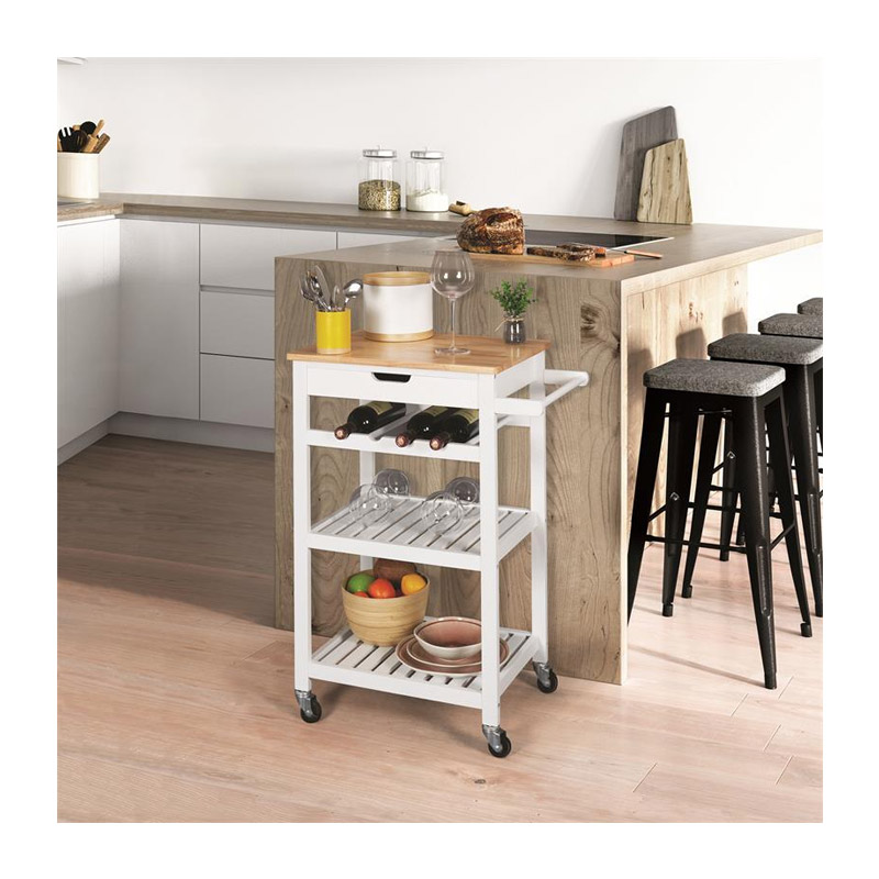 Το ξύλινο τρόλεϊ κουζίνας, από την εταιρία Home Deco Factory, αποτελεί ιδανική επιλογή για να έχετε πάντα τακτοποιημένα τα τρόφιμά σας, καθώς και διάφορα μαγειρικά σκεύη και πιάτα. Είναι κατασκευασμένο από ισχυρό και ανθεκτικό MDF για μεγάλη διάρκεια ζωής. Διαθέτει 1 ευρύχωρη άνω επιφάνεια, 1 συρτάρι , 2 ράφια για την αποθήκευση μεγαλύτερων αντικειμένων, λαβή που λειτουργεί ως ράγα πετσετών και υποδοχή για 4 μπουκάλια.