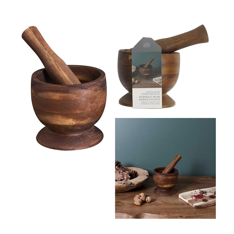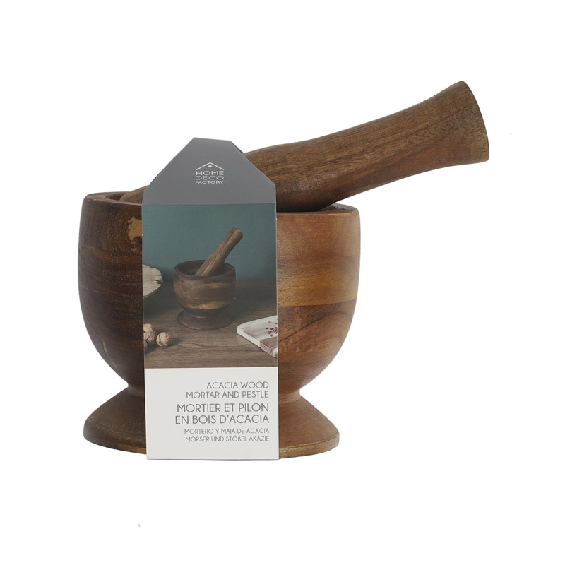Το γουδί με γουδοχέρι, από την εταιρία Home Deco Factory, είναι κατασκευασμένα από ξύλο ακακίας. Το ξύλο ακακίας, είναι ένα φυσικό και σκληρό υλικό που είναι ανθεκτικό στις γρατζουνιές. Ιδανικά ακόμα και τα πιο σκληρά μπαχαρικά.