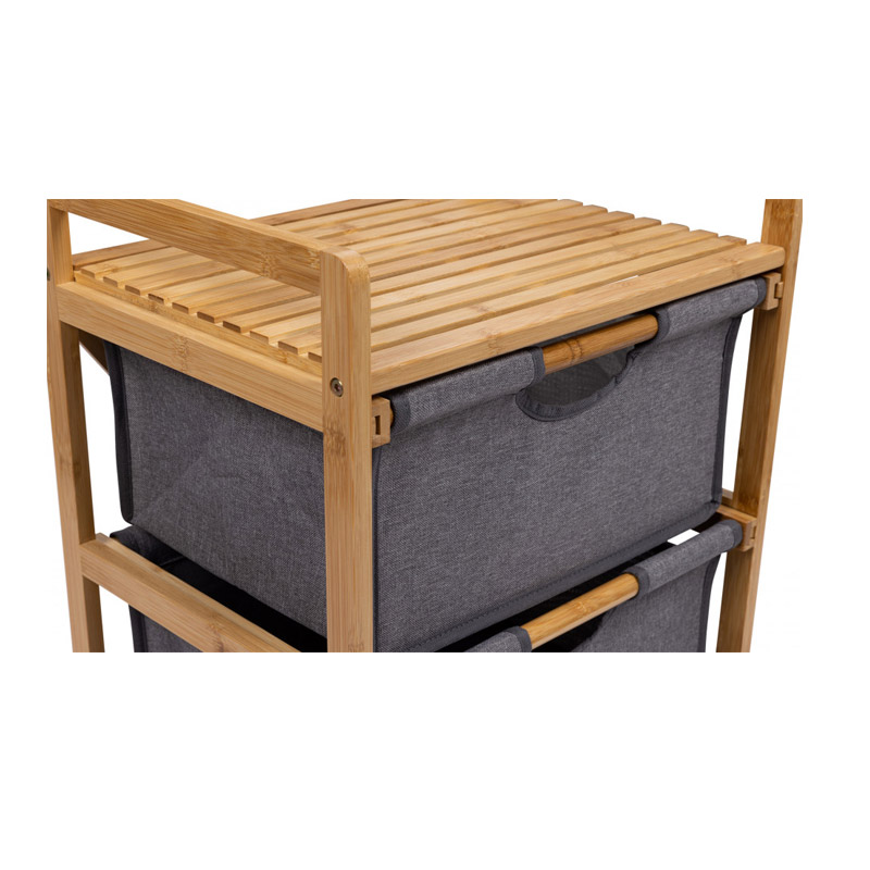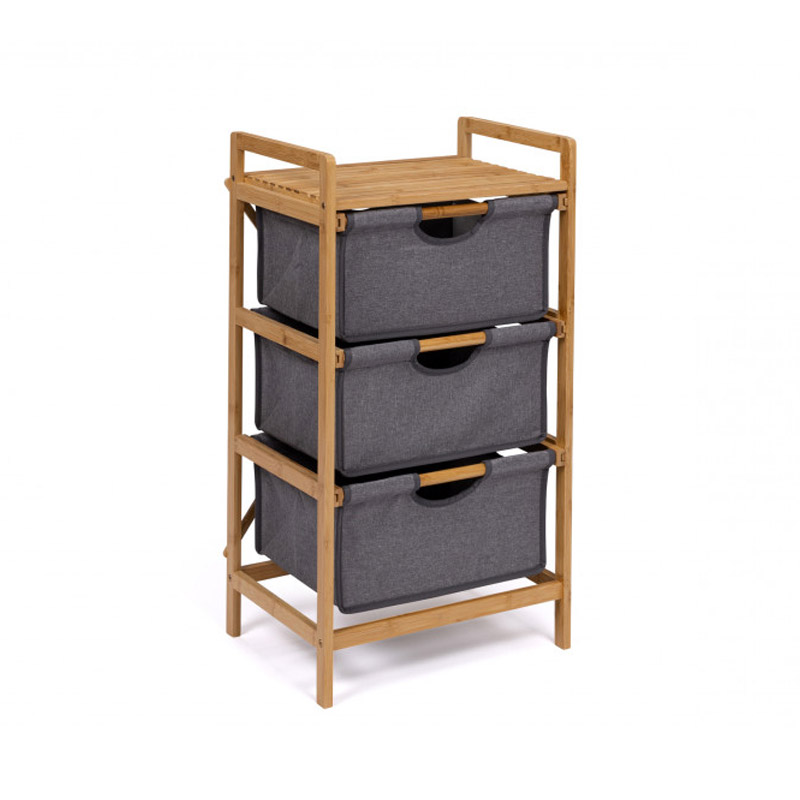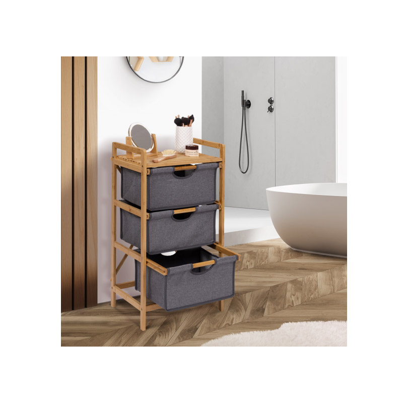 Η ραφιέρα μπάνιου, από την εταιρία Idomya, είναι κατασκευασμένη από ξύλο μπαμπού. Διαθέτει 3 υφασμάτινα συρτάρια με μασίφ πάτο.