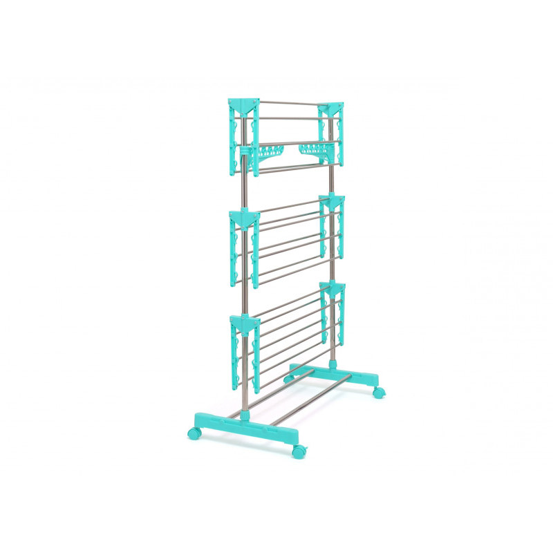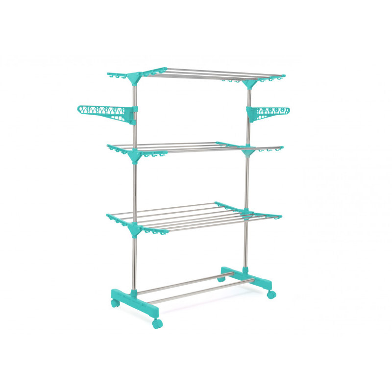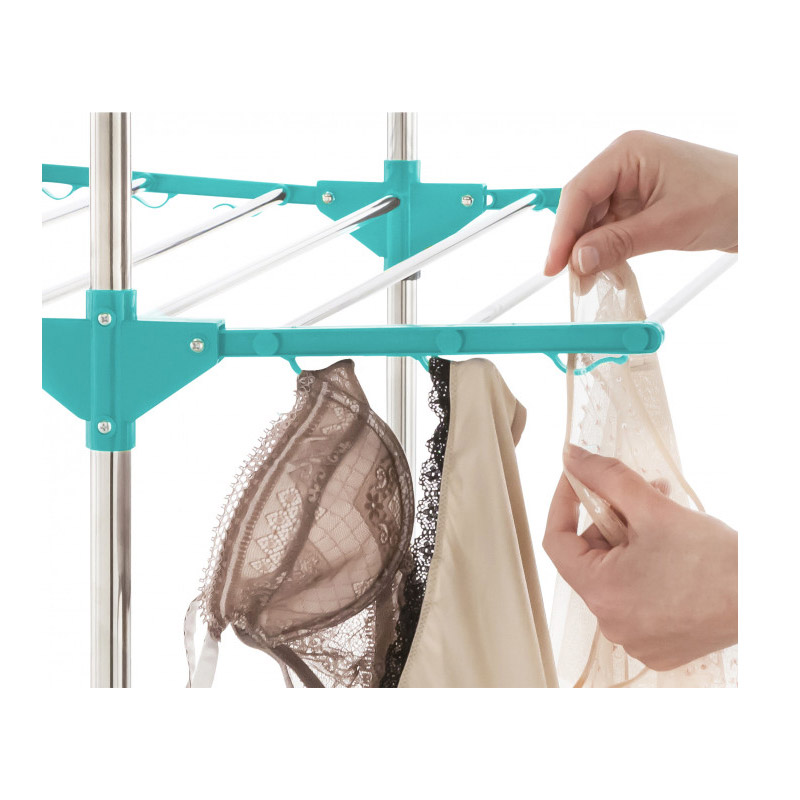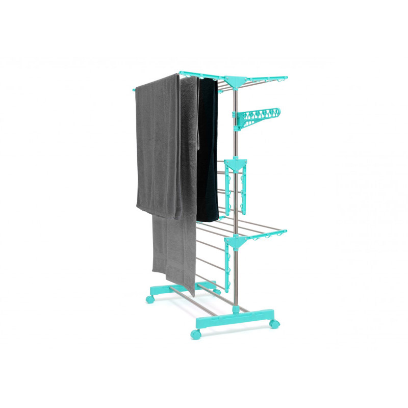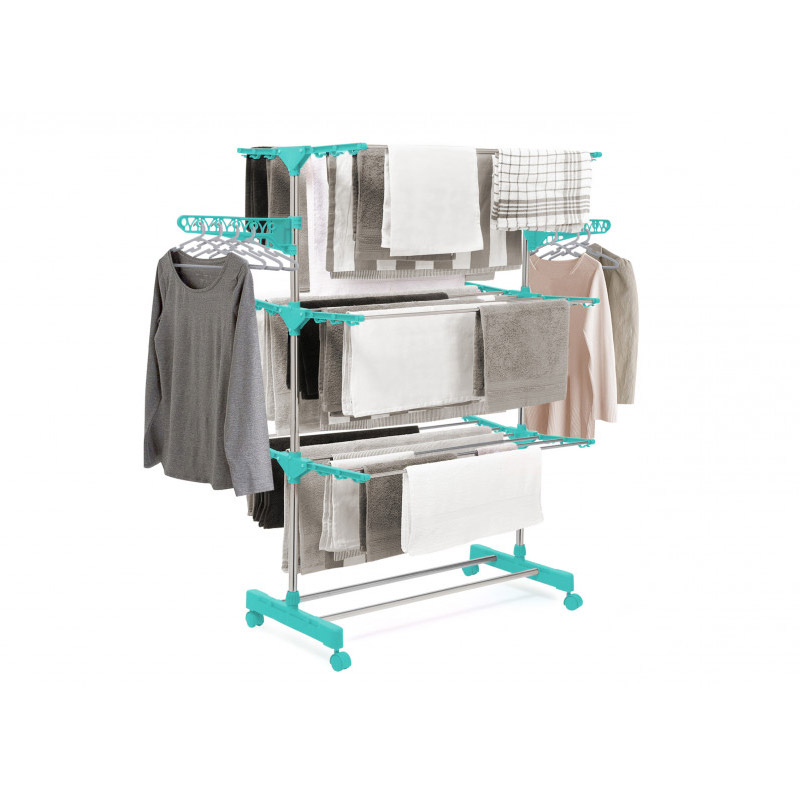 Η απλώστρα, διαθέτει 3 διπλά πτυσσόμενα επίπεδα στεγνώματος με ανθεκτικές ράβδους μακράς διαρκείας, καθώς και 2 πλευρικές πτυσσόμενες θέσεις ρυθμιζόμενες σε ύψος για να κρεμάσετε ρούχα σε κρεμάστρες. Η απόσταση μεταξύ των ράβδων είναι ιδανική ώστε τα ρούχα να αερίζονται τέλεια για γρήγορο στέγνωμα τον χειμώνα αλλά και το καλοκαίρι. Επιπλέον, στη βάση της απλώστρας μπορείτε να στεγνώνετε τα υποδήματά σας.