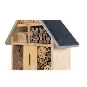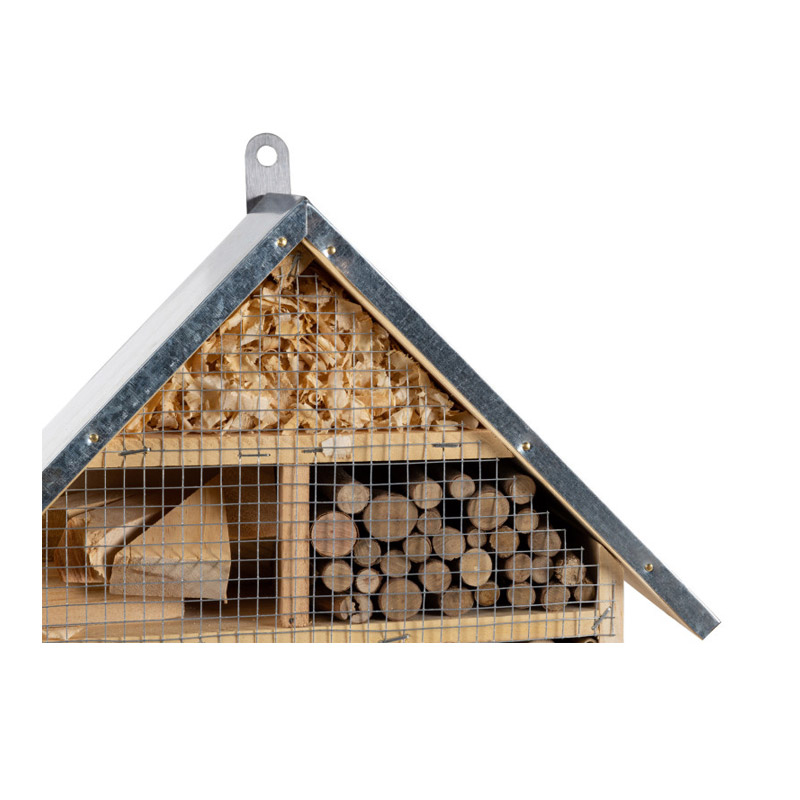 Το σπίτι για έντομα, από την εταιρία Inkazen, θα δώσει μια διακοσμητική πινελιά στον κήπο σας και θα είναι το ιδανικό καταφύγιο για έντομα απαραίτητα για τη φύση, είτε για φυτά, είτε για λουλούδια είτε για φυσική ρύθμιση. Οι επάνω θήκες με νεκρό ξύλο, άχυρο και στρογγυλό ξύλο είναι ιδιαίτερα κατάλληλες για μέλισσες και δερμάπτερα (ψαλίδες). Η θήκη με μπαμπού και τρυπημένο ξύλο για μέλισσες, το διαμέρισμα με τρύπες για πεταλούδες και αυτό με κουκουνάρια είναι ιδανικό για νευρόπτερα και πασχαλίτσες.