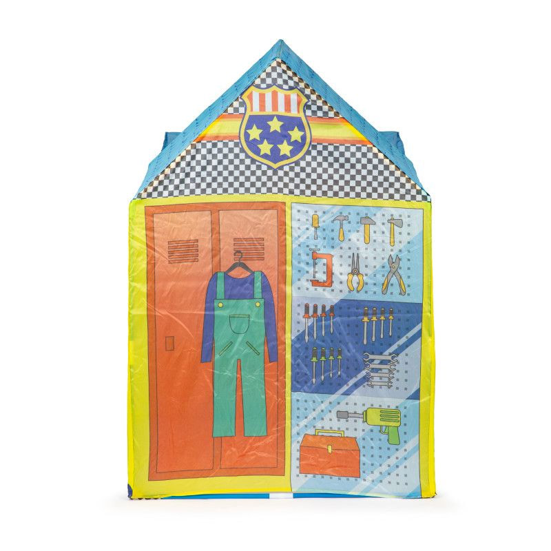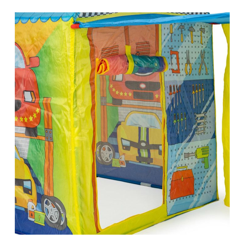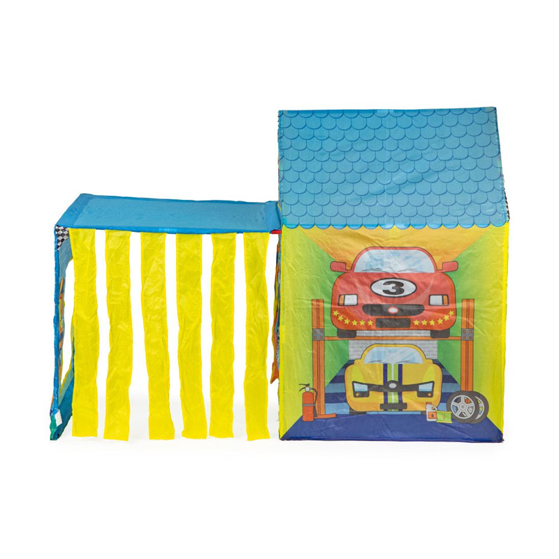 Η παιδική σκηνή, από την εταιρία IPLAY, είναι διακοσμημένη στην ατμόσφαιρα ενός συνεργείου αυτοκινήτων, πλυντήριο αυτοκινήτων και βενζινάδικο. Είναι κατασκευασμένη από ισχυρό και αδιάβροχο πολυεστέρα, κατάλληλη για χρήση και σε εξωτερικό χώρο. Ο σκελετός είναι πολύ ελαφρύς, διπλώνεται εύκολα και μπορεί εύκολα να μετακινηθεί όλη η δομή. Η σκηνή έχει δύο εισόδους με κουρτίνες.