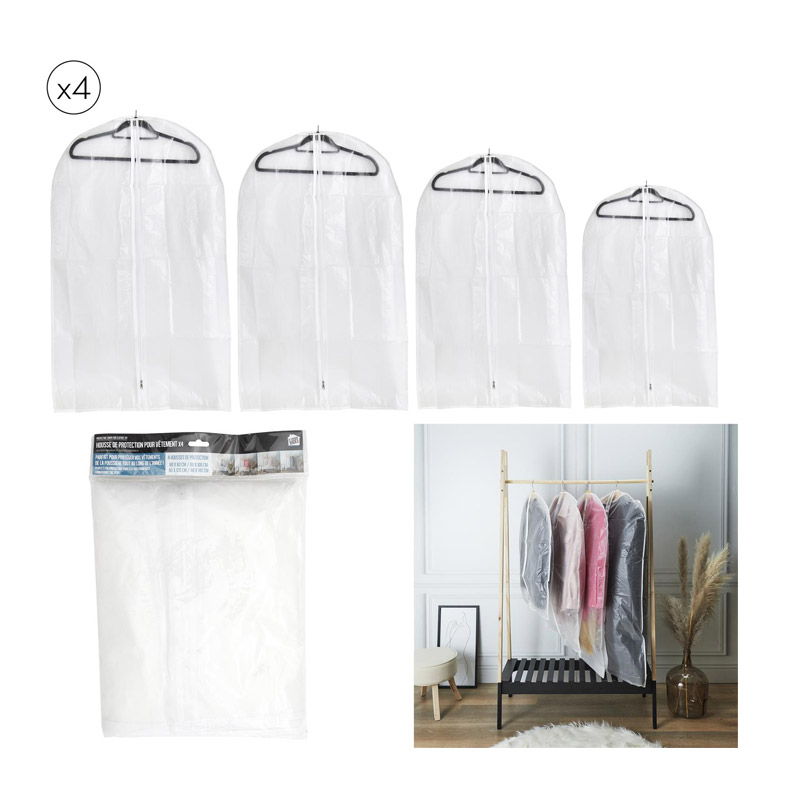 Το σετ, από την εταιρία JE CHERCHE UNE IDEE, αποτελείται από 4 κρεμαστές θήκες για την προφύλαξη των ρούχων σας. Με διαφορετικές διαστάσεις για όλα τα είδη ρούχων και κλείσιμο με φερμουάρ.