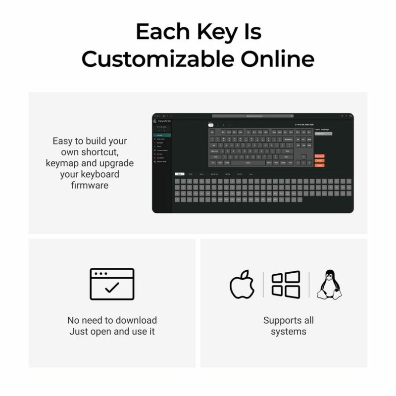 Το ανοιχτού κώδικα firmware QMK σημαίνει ατελείωτες δυνατότητες για αναδιάταξη πλήκτρων, μακροεντολές, συντομεύσεις και πολλά άλλα. Τώρα μπορείτε να προσαρμόσετε εύκολα κάθε πλήκτρο με την εφαρμογή Keychron Launcher.