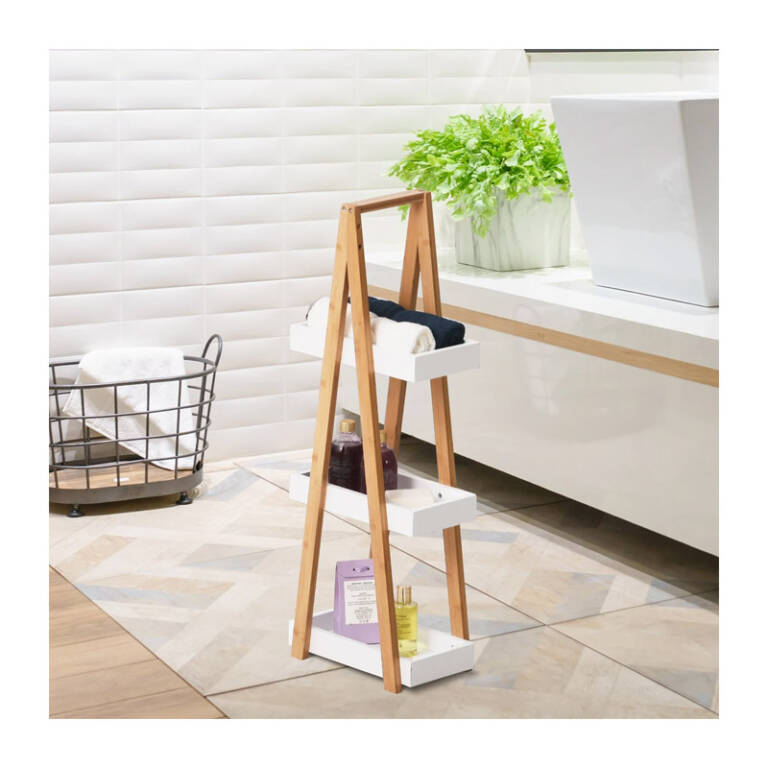 Η ραφιέρα μπάνιου, από την εταιρία Kleankin, είναι κατασκευασμένη από ανθεκτικό MDF και φυσικό ξύλο μπαμπού, με ομαλό φινίρισμα με στρογγυλεμένες γωνίες και διαθέτει τρία ευρύχωρα αποθηκευτικά ράφια.