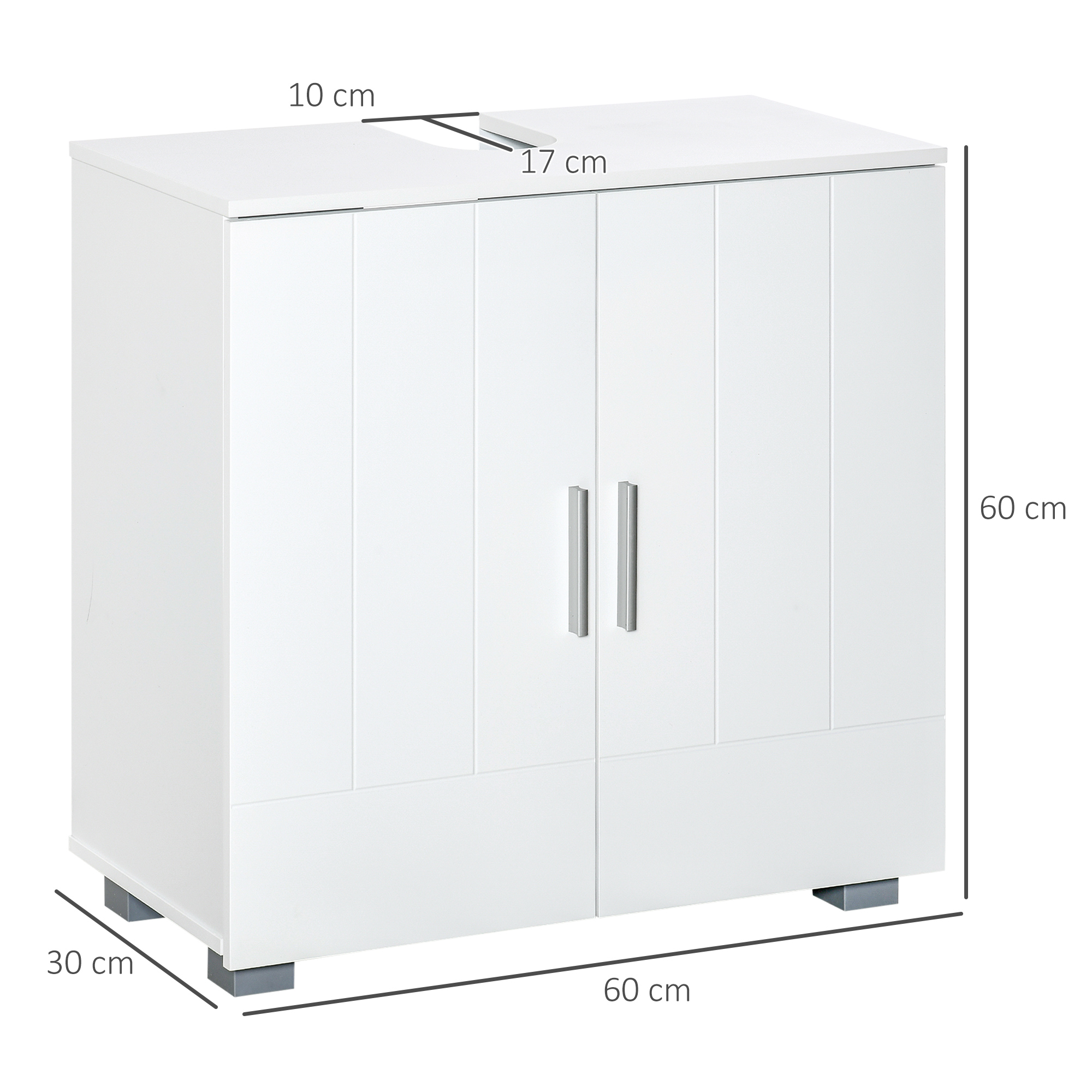 Το ντουλάπι νιπτήρα, από την εταιρία Kleankin, είναι κατασκευασμένο από ανθεκτικό MDF, με αδιάβροχη επιφάνεια που καθαρίζεται εύκολα. Μια εγκοπή σε σχήμα “U” 10 x 17 cm, έχει σχεδιαστεί για να χωράει άνετα το ντουλάπι κάτω από τον σωλήνα του νιπτήρα, χωρίς να καταλαμβάνει επιπλέον χώρο. Στο εσωτερικό του, διαθέτει ένα ρυθμιζόμενο ράφι 3 επιπέδων, για να χωρά αντικείμενα διαφορετικών μεγεθών.