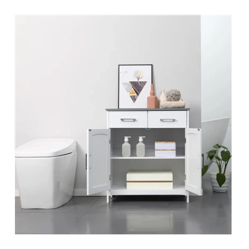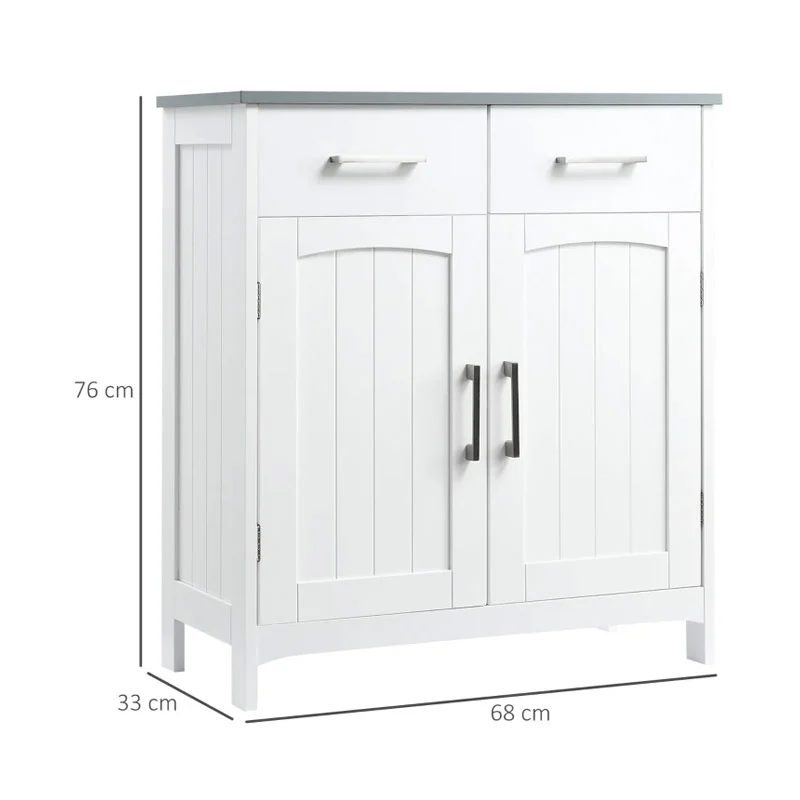 Το ντουλάπι μπάνιου, από την εταιρία Kleankin, είναι κατασκευασμένο από σανίδα MDF με φινίρισμα προστασίας από το νερό. Ο ιμάντας κατά της ανατροπής θα μπορούσε να προσφέρει μεγαλύτερη ασφάλεια. Έχει 2 συρτάρια και ένα ντουλάπι 2 θυρών, που σας επιτρέπει να αποθηκεύετε προϊόντα περιποίησης και να τα προστατεύετε από το νερό. Ένα ρυθμιζόμενο ράφι μέσα στο ντουλάπι, μπορεί να μετακινηθεί πάνω-κάτω ανάλογα με τις διαφορετικές ανάγκες σας.