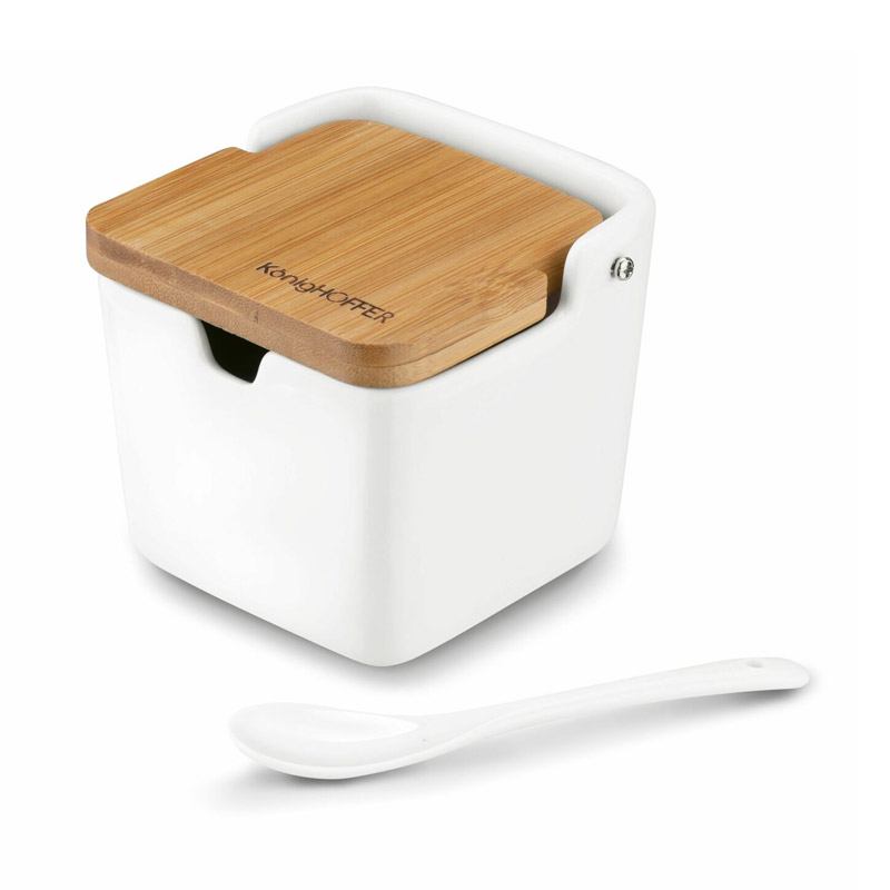 Το δοχείο για ζάχαρη της KonigHOFFER είναι κατασκευασμένο από πορσελάνη με καπάκι από μπαμπού. Διαθέτει εύχρηστο κουτάλι από πορσελάνη για τέλειο σερβίρισμα. Είναι ιδανικό για να αποθηκεύετε καφέ, ζάχαρη, κακάο και ό,τι άλλο θέλετε.