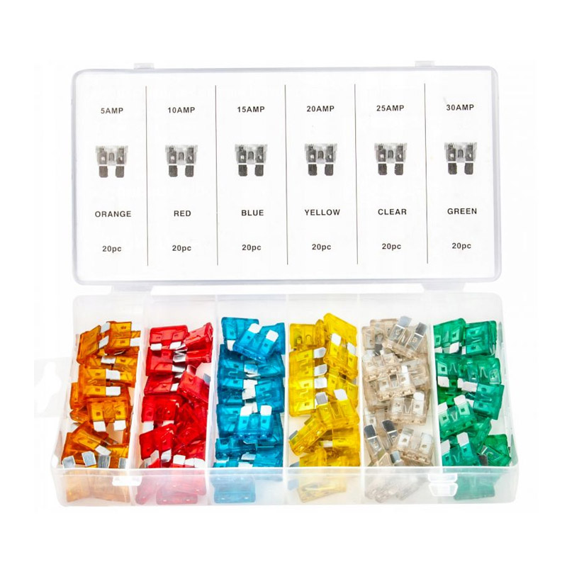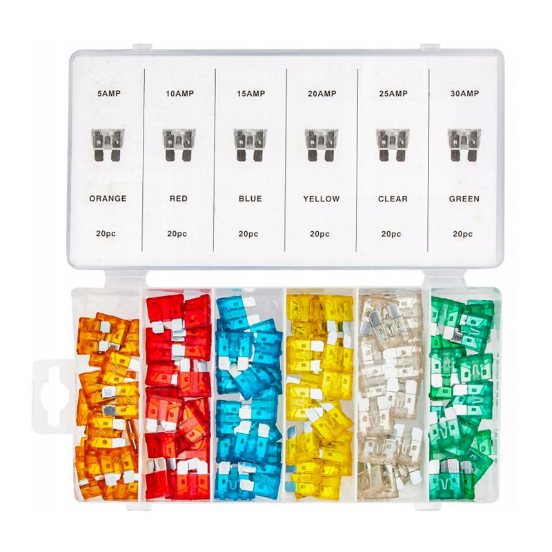 Το σετ, από την εταιρία Kraft&Dele, αποτελείται από 120 ασφάλειες αυτοκινήτου 5 – 30A, οι οποίες φέρουν διαφορετικό χρώμα ανάλογα με την τιμή έντασης τους. Συνοδεύονται από ένα πλαστικό κουτί ταξινόμησης και αποθήκευσης.