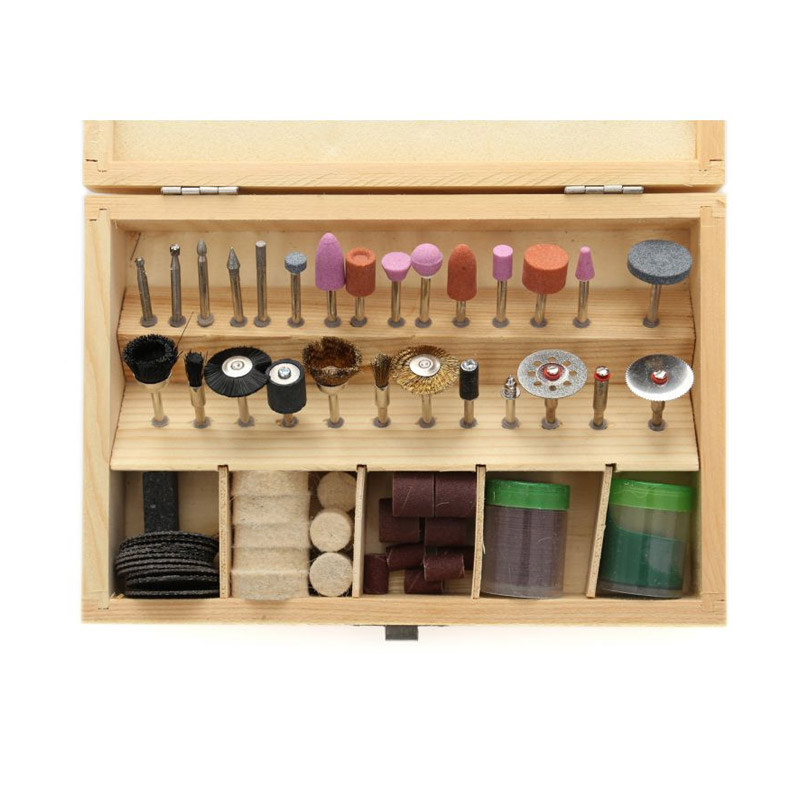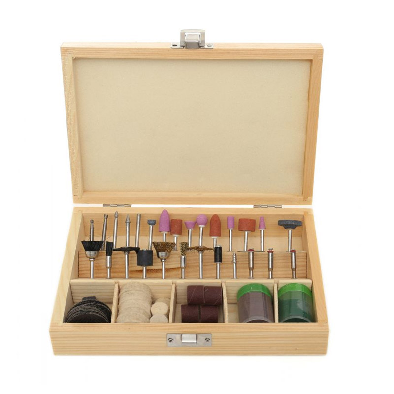 Περιλαμβάνει αξεσουάρ που σας επιτρέπουν να εκτελείτε δραστηριότητες όπως: σκάλισμα, χάραγμα, λείανση, ακόνισμα, καθαρισμός, στίλβωση, κοπή και πολλά άλλα. Όλα είναι κατασκευασμένα από ανθεκτικά, υψηλής ποιότητας υλικά και συνοδεύονται από μασίφ, ξύλινη θήκη.