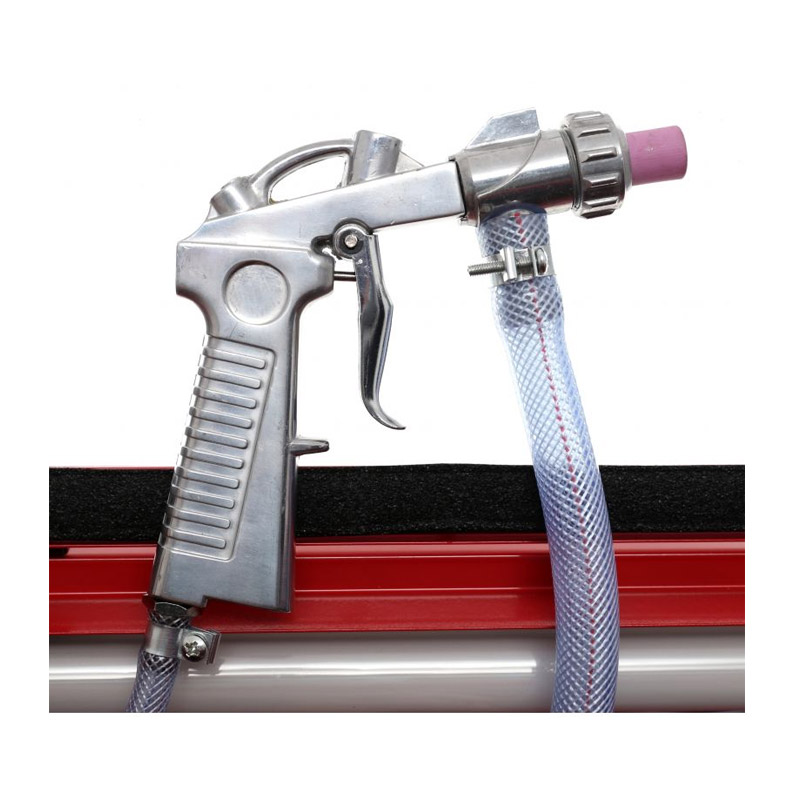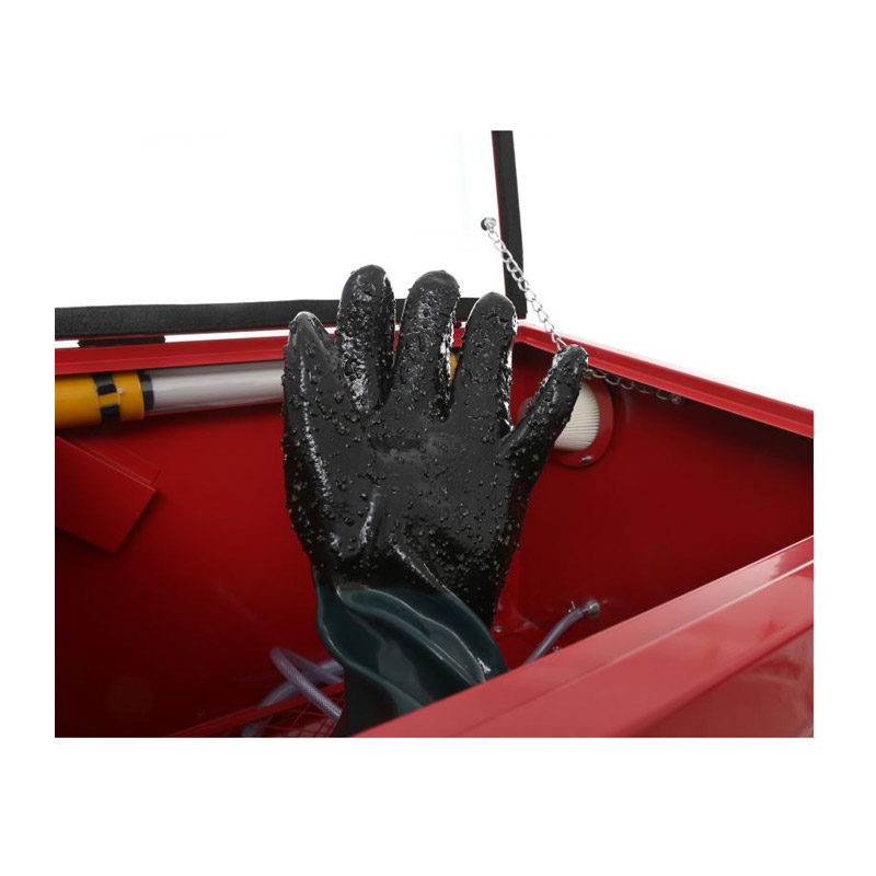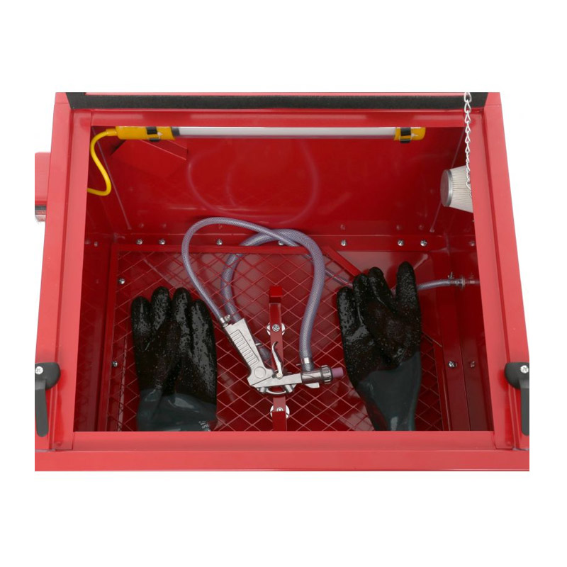 Διαθέτει 1 μεταλλικό πιστόλι αμμοβολής, 2 μεγάλα ενσωματωμένα γάντια, φίλτρα και 3 συμπαγή ακροφύσια. Είναι επίσης εξοπλισμένη με οπίσθιο φωτισμό LED και μεγάλο γυάλινο καπάκι (παρμπρίζ) για μεγαλύτερη ευκολία. Λειτουργεί σε ένα κλειστό σύστημα, το λειαντικό συλλέγεται από τον πυθμένα, και στη συνέχεια εκτοξεύεται από το ακροφύσιο του πιστολιού αμμοβολής κάτω από συμπιεσμένο αέρα.