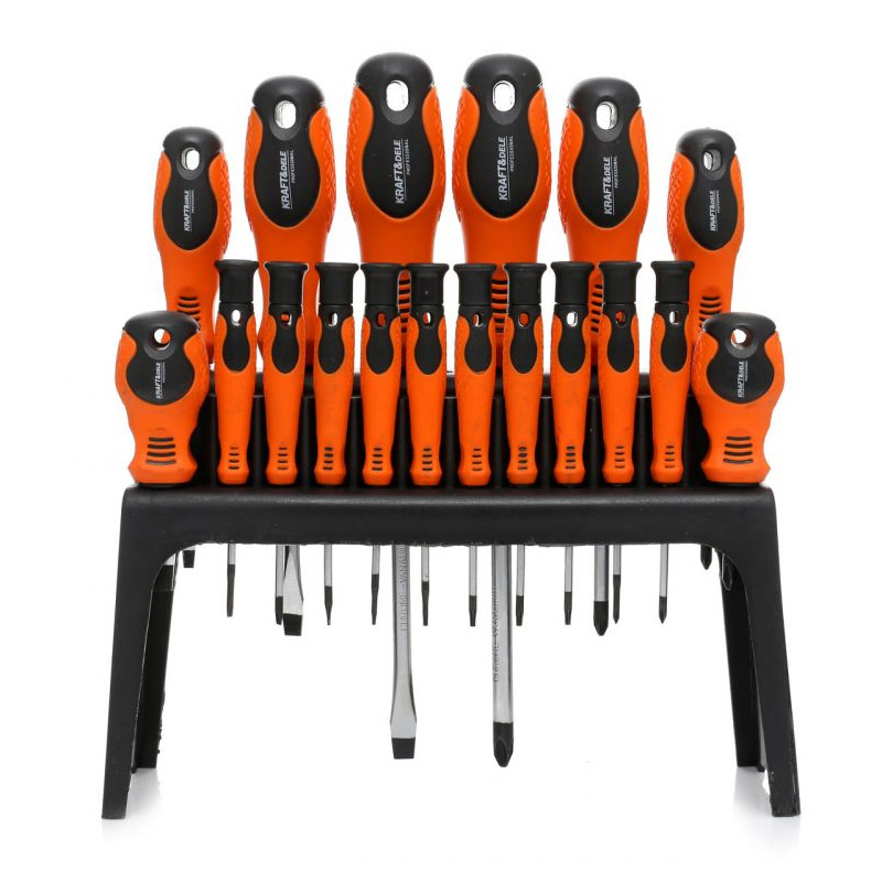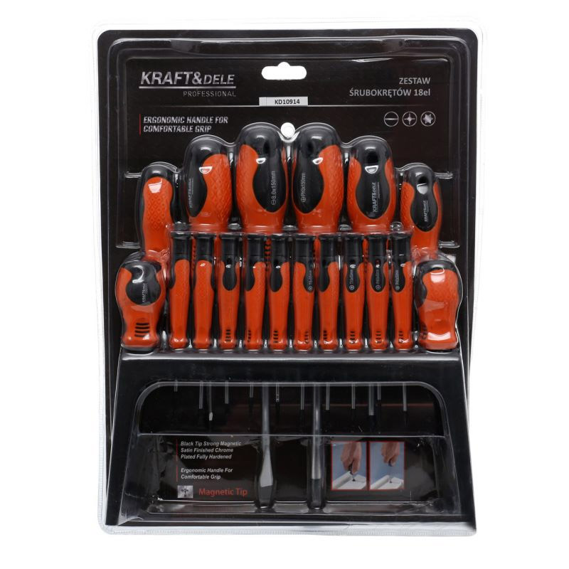Το σετ, από την εταιρία Kraft&Dele, αποτελείται από 18 μαγνητικά κατσαβίδια υψηλής ποιότητας, με εργονομικές λαβές, καθώς και μία βάση στήριξης.