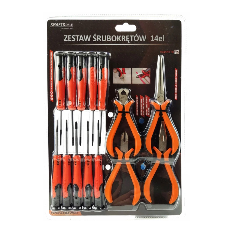 Το σετ, από την εταιρία Kraft&Dele, αποτελείται από κατσαβίδια και πένσες ακριβείας, με αντιολισθητικές λαβές.