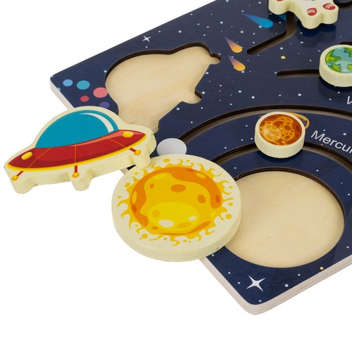 Το ξύλινο παζλ “Ηλιακό Σύστημα” , από την εταιρεία Kruzzel, είναι ένα διαδραστικό εκπαιδευτικό παιχνίδι που αναπτύσσει τις γνώσεις του παιδιού για τους πλανήτες και το διάστημα. Η επιφάνεια του πίνακα περιλαμβάνει κινούμενα, χρωματιστά στοιχεία που απεικονίζουν όλους τους πλανήτες του Ηλιακού Συστήματος. Στόχος του παιδιού είναι να μετακινεί τους πλανήτες σε ειδικές διαδρομές και να τους ταιριάζει στα κατάλληλα ονόματα και αριθμούς που φαίνονται στο κάτω μέρος του πίνακα. Κάθε πλανήτης έχει αρίθμηση, που βοηθά στη μάθηση της σειράς των πλανητών στο ηλιακό σύστημα, καθιστώντας το παιχνίδι ιδανικό για μάθηση και διασκέδαση, ενώ παράλληλα αναπτύσσει τις κινητικές δεξιότητες. Είναι κατασκευασμένο από ξύλο πεύκου, προσφέροντας ανθεκτικότητα και αισθητική εμφάνιση. Η επιφάνεια του πίνακα είναι καλυμμένη με επιστρωμένο χαρτί, που του δίνει λεία υφή και ανθεκτικότητα στη φθορά. Επιπλέον, όλες οι άκρες είναι προσεκτικά στρογγυλεμένες, καθιστώντας το παιχνίδι ασφαλέστερο, εξαλείφοντας τον κίνδυνο τραυματισμού.