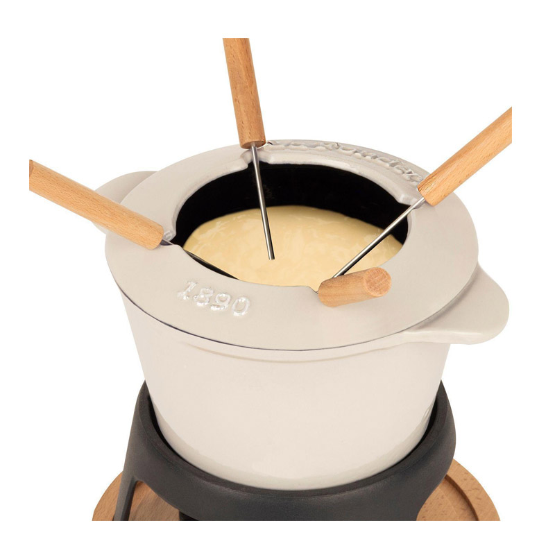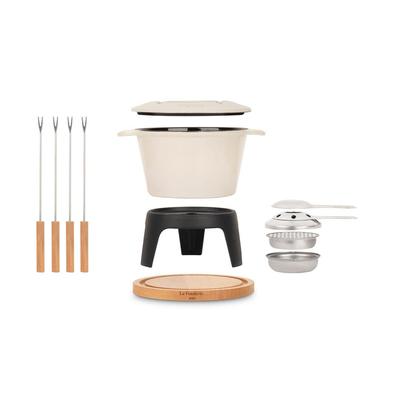 Η συσκευή, από την εταιρία H.Koenig, σας δίνει τη δυνατότητα να παρασκευάσετε φοντύ από διάφορα τυριά η ακόμη και από σοκολάτα. Διαθέτει αφαιρούμενο εμαγιέ μπολ από χυτοσίδηρο χωρητικότητας 1.2 Lt το οποίο πλένεται στο πλυντήριο πιάτων, 4 πιρούνια με λαβές από ξύλο οξιάς, φυσική ξύλινη βάση πάνω στην οποία τοποθετείται το δοχείο καυσίμου. Μπορεί να χρησιμοποιηθεί σε ηλεκτρικές εστίες, κεραμικές, επαγωγικές, γκαζιού, γκριλ και εστίες φούρνου.