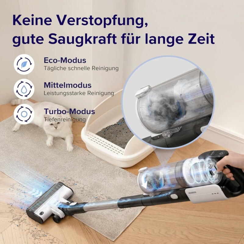Η ειδικά σχεδιασμένη βούρτσα κατοικίδιων απομακρύνει αποτελεσματικά τις τρίχες κατοικίδιων από χαλιά, υφασμάτινες επενδύσεις και άλλες επιφάνειες, ενώ η τεχνολογία κατά του μπλεξίματος αποτρέπει τις ενοχλητικές δυσκολίες. Με εντυπωσιακή διάρκεια λειτουργίας έως και 50 λεπτά και ισχυρή απορροφητική δύναμη, αυτή η σκούπα προσφέρει μέγιστη ευελιξία και αποδοτικότητα. Χάρη στον ελαφρύ σχεδιασμό της και την ασύρματη χρήση, είναι ιδιαιτέρως φιλική προς το χρήστη και εύκολη στη χρήση.