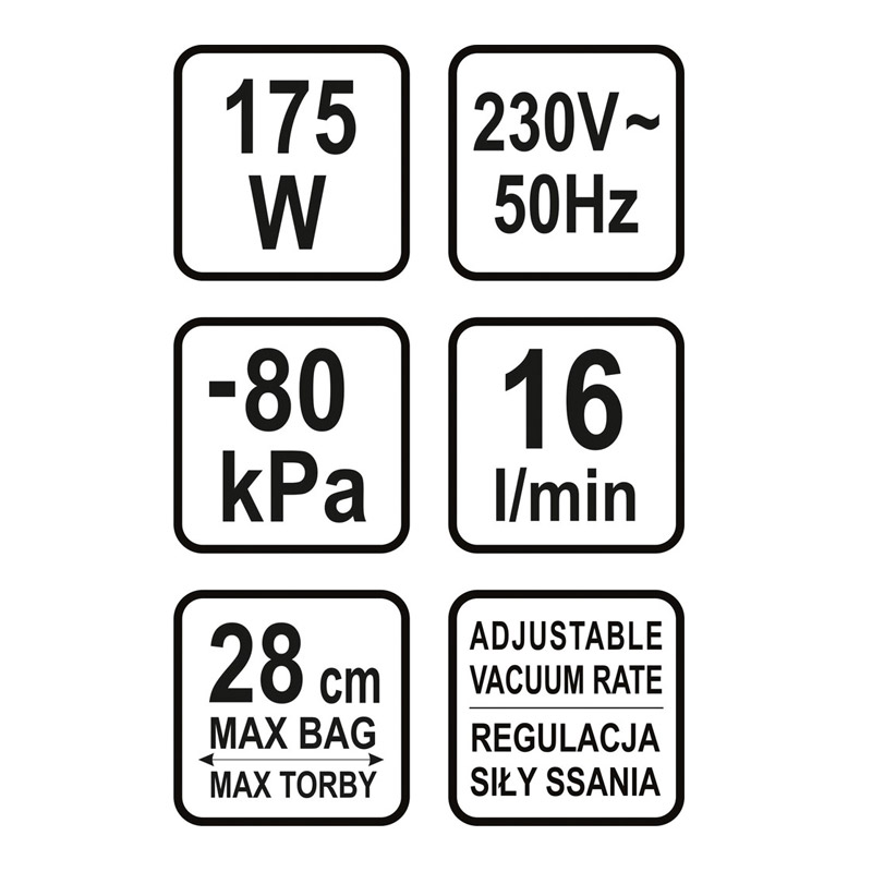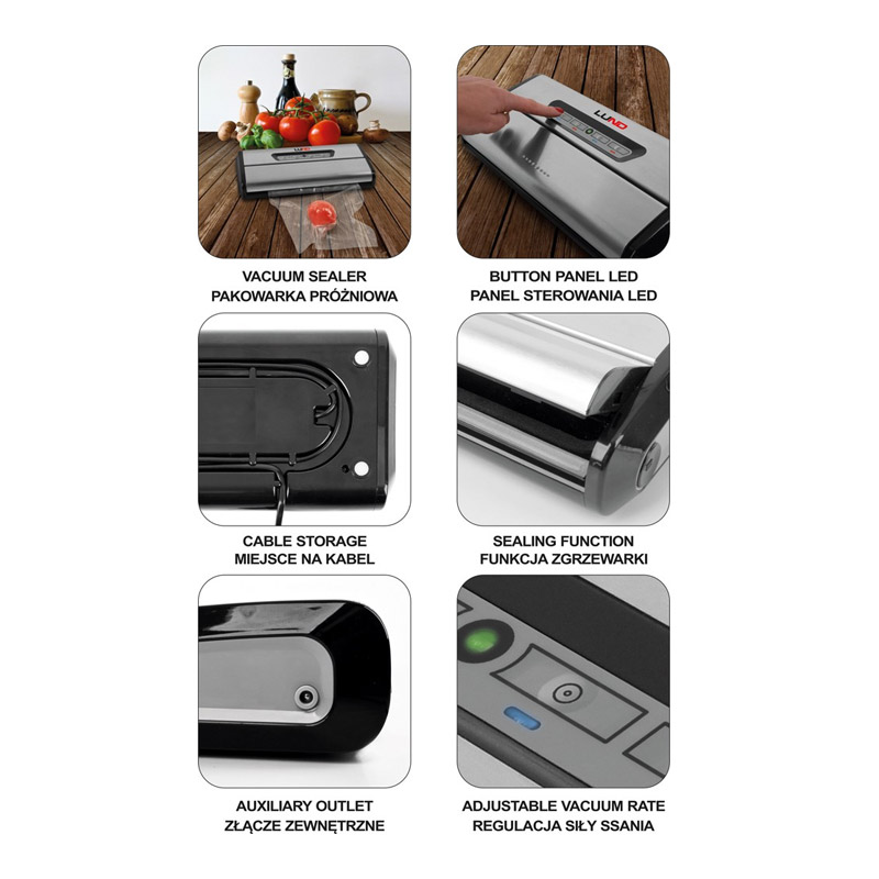 Η συσκευή, από την εταιρία LUND, έχει μέγιστο μήκος σφραγίσματος σακούλας 280 mm και ισχύ 175 W. Για τη συγκόλληση μπορούν να χρησιμοποιηθούν λείες και σαγρέ σακούλες, αλλά για την αναρρόφηση του αέρα μπορούν να χρησιμοποιηθούν μόνο σαγρέ σακούλες.