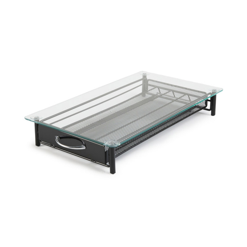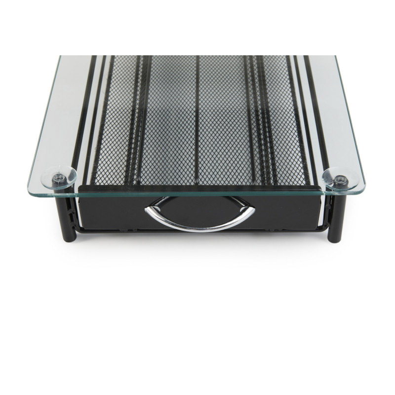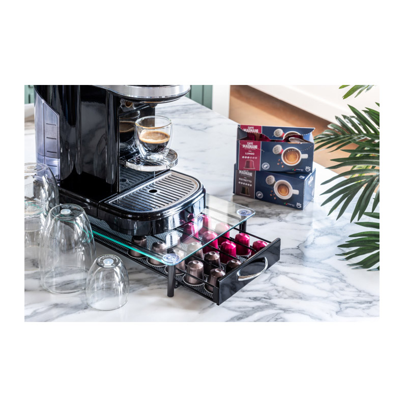 Το συρτάρι – διοργανωτής, είναι κατασκευασμένο από μέταλλο και διαθέτει γυάλινη, ανθεκτική επιφάνεια και αντιολισθητικά πόδια, για μέγιστη σταθερότητα. Έχετε τη δυνατότητα να αποθηκεύσετε από 40 κάψουλες καφέ και μπορείτε να τοποθετήσετε πάνω του την καφετιέρα.