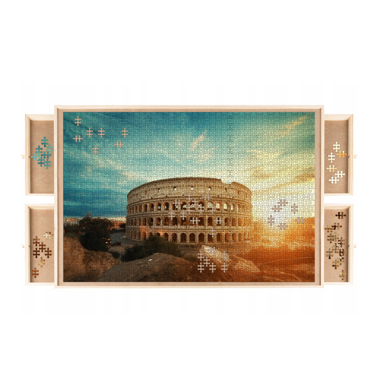 Το τραπέζι παζλ, από την εταιρία Malatec, είναι κατασκευασμένο για από ξύλο πεύκου και μοριοσανίδα. Διαθέτει 4 πλαϊνά συρτάρια που θα σας βοηθήσουν να διαχωρίσετε τα κομμάτια του παζλ σε μεμονωμένες ομάδες. Είναι κατάλληλο για έως και 1500 κομμάτια.