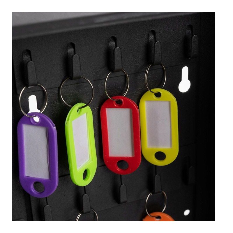 Εσωτερικά, διαθέτει 48 άγκιστρα για κλειδιά, και επιπλέον στη συσκευασία περιλαμβάνονται 30 αναγνωριστικά σε συνδυασμό χρωμάτων, με δυνατότητα προσθήκης σύντομου κειμένου ή αριθμού, που θα σας επιτρέψουν να σημειώσετε και να βρείτε γρήγορα και να επανατοποθετήσετε τα κλειδιά στην κλειδοθήκη.